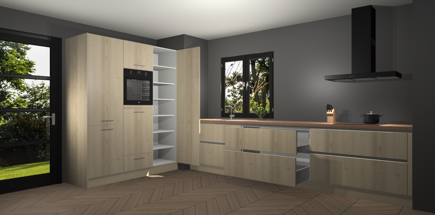 De softclose deuren openen en sluiten is ook heel eenvoudig - geniet van een moeiteloze keukenervaring, zelfs als er kinderen rondlopen. Voor extra gemak bij het plaatsen van uw bestelling bieden we ook een upgrade naar een kookplaat met geïntegreerde afzuiging.