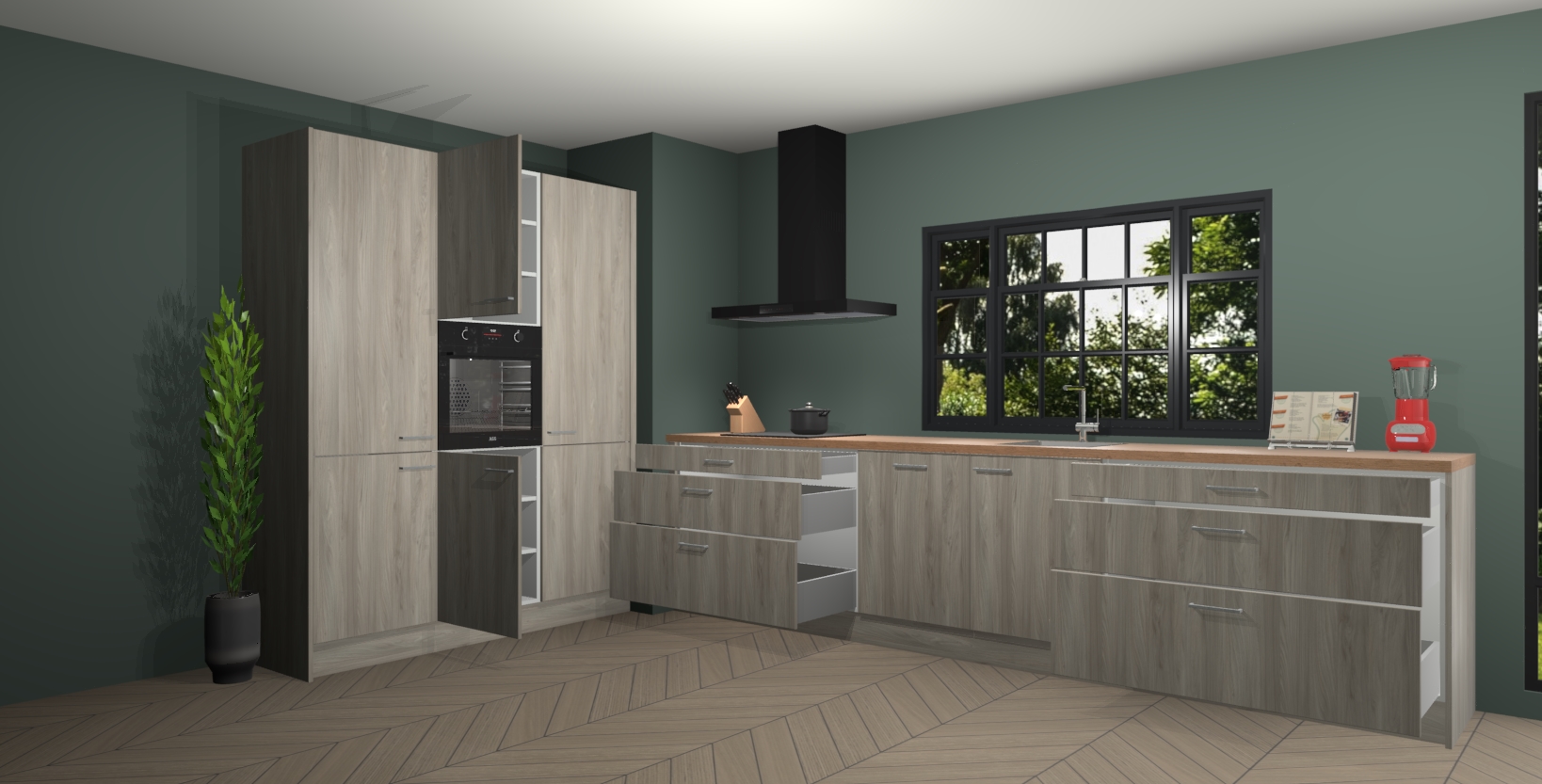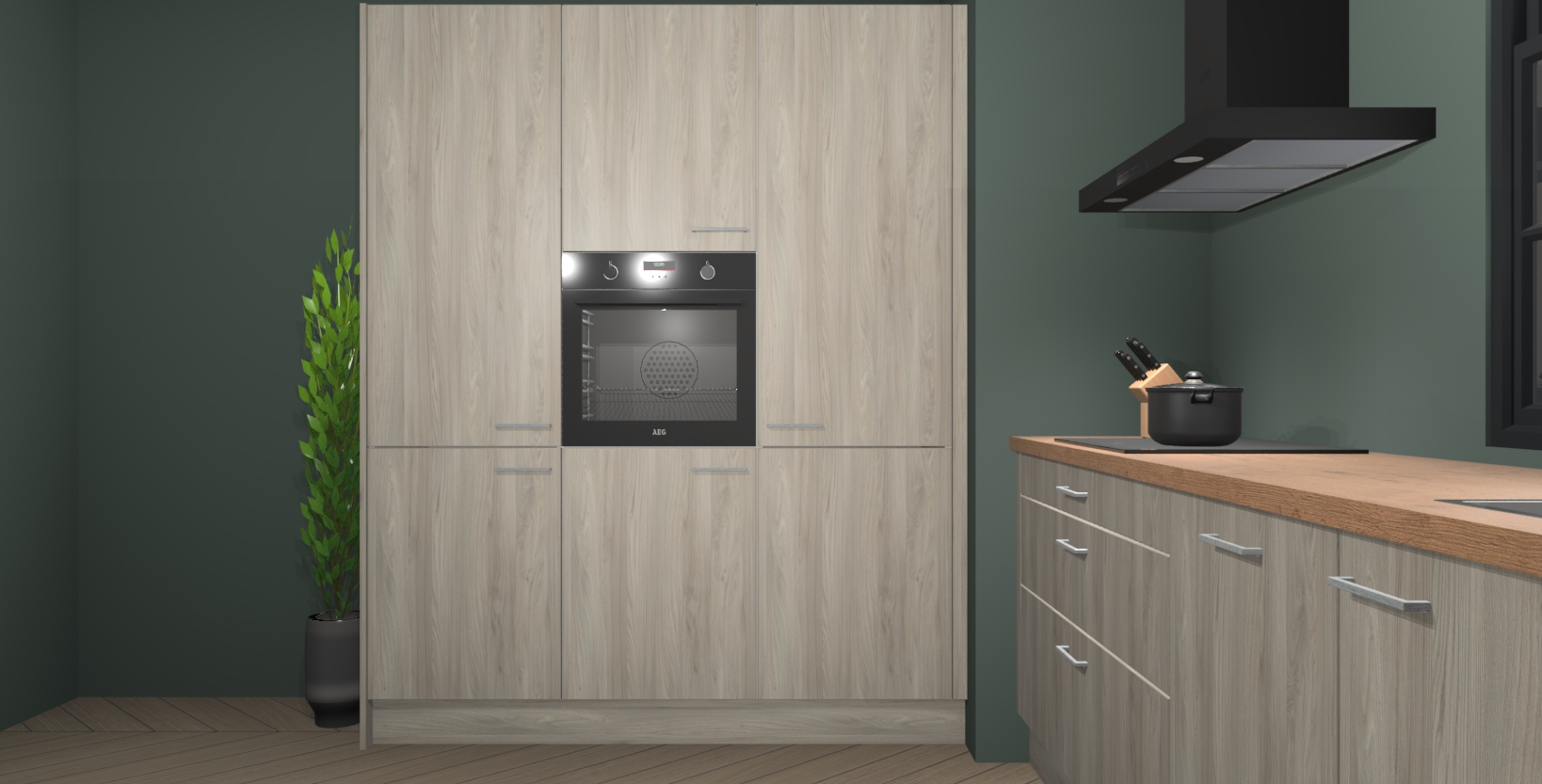 De softclose deuren openen en sluiten is ook heel eenvoudig - geniet van een moeiteloze keukenervaring, zelfs als er kinderen rondlopen. Voor extra gemak bij het plaatsen van uw bestelling bieden we ook een upgrade naar een kookplaat met geïntegreerde afzuiging.