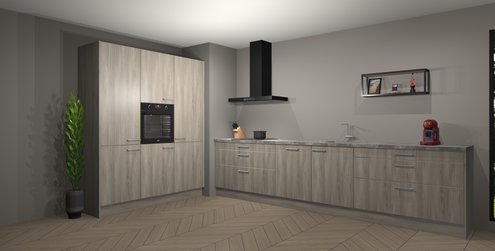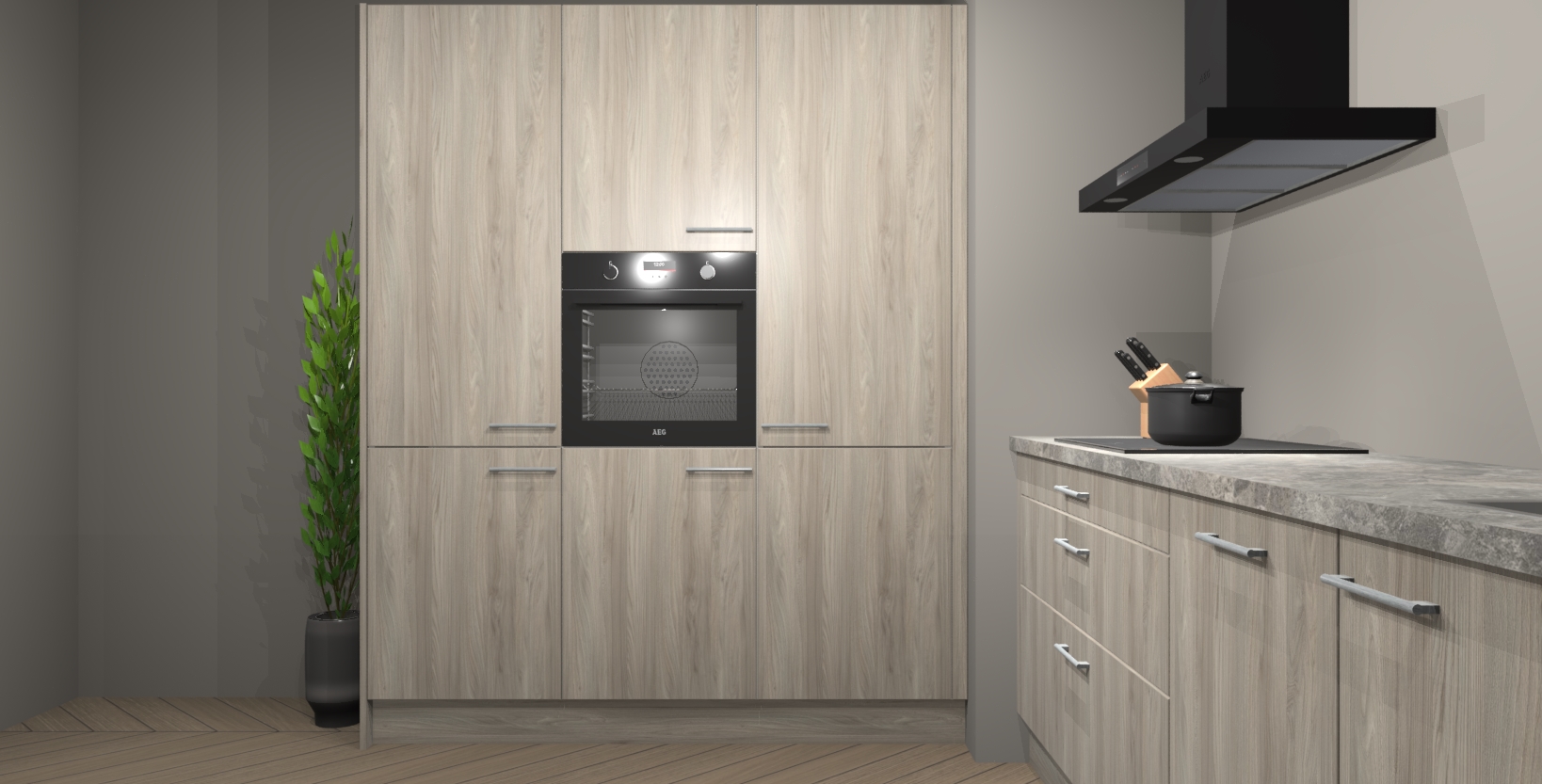 De softclose deuren openen en sluiten is ook heel eenvoudig - geniet van een moeiteloze keukenervaring, zelfs als er kinderen rondlopen. Voor extra gemak bij het plaatsen van uw bestelling bieden we ook een upgrade naar een kookplaat met geïntegreerde afzuiging.