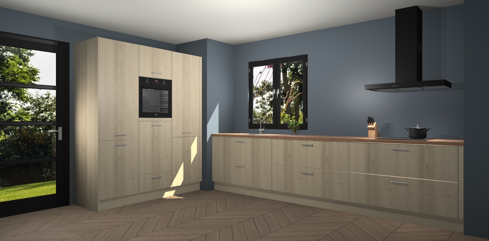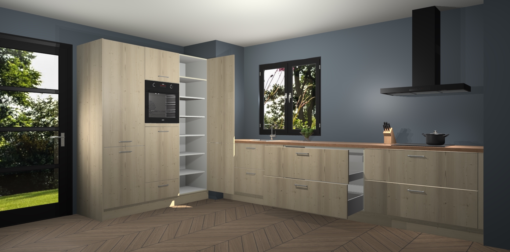 De softclose deuren openen en sluiten is ook heel eenvoudig - geniet van een moeiteloze keukenervaring, zelfs als er kinderen rondlopen. Voor extra gemak bij het plaatsen van uw bestelling bieden we ook een upgrade naar een kookplaat met geïntegreerde afzuiging.