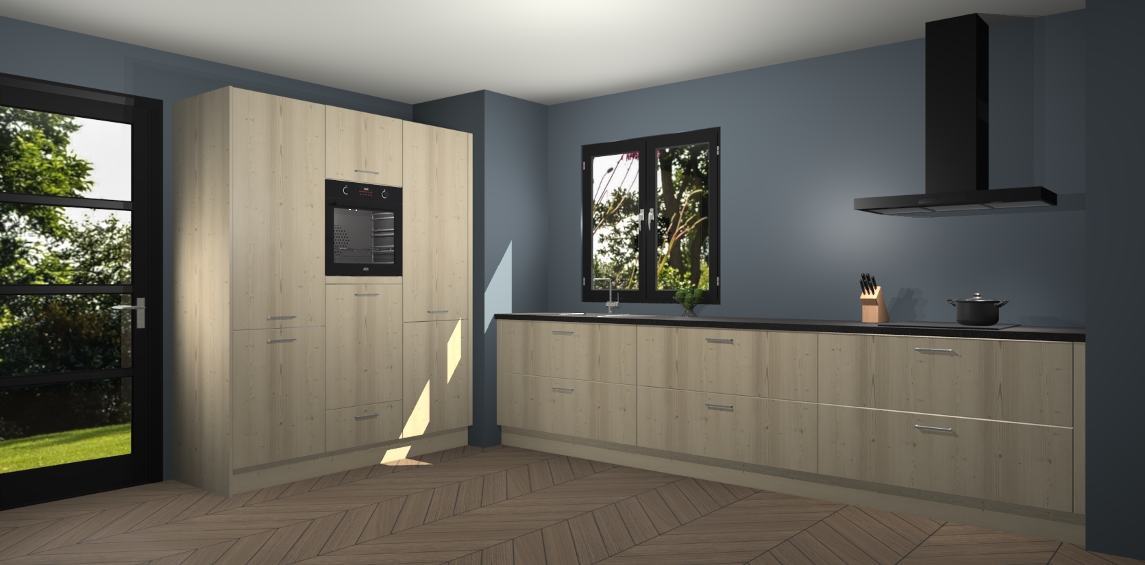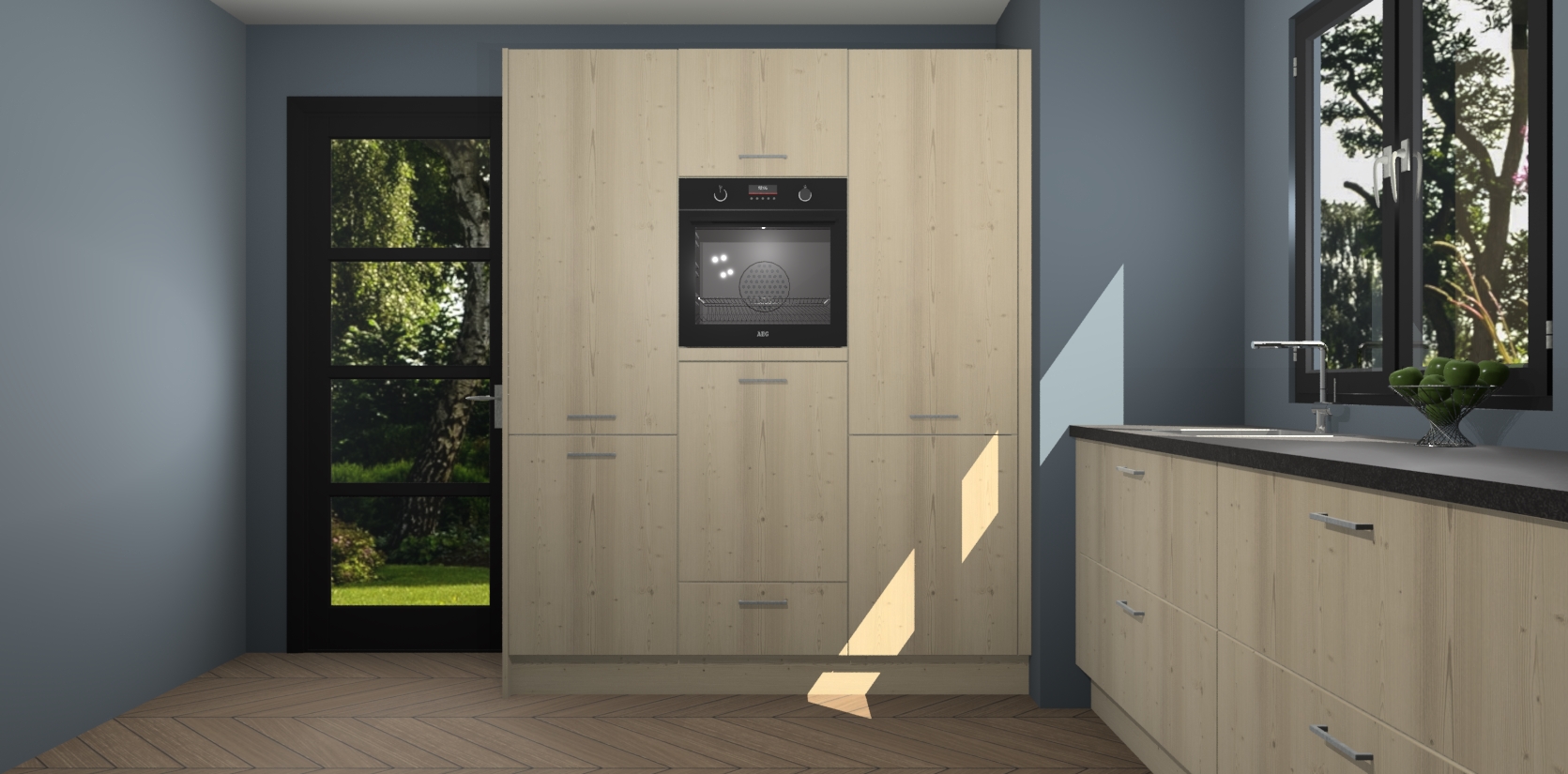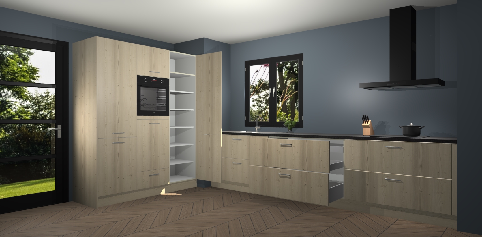 De softclose deuren openen en sluiten is ook heel eenvoudig - geniet van een moeiteloze keukenervaring, zelfs als er kinderen rondlopen. Voor extra gemak bij het plaatsen van uw bestelling bieden we ook een upgrade naar een kookplaat met geïntegreerde afzuiging.