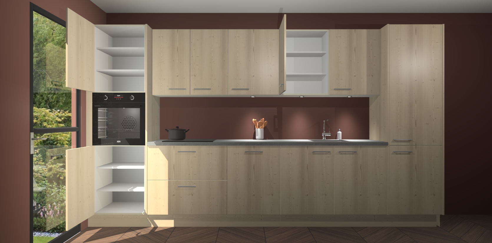 Dit is de perfecte keuken voor wie op zoek is naar een luxueuze stijl zonder zijn portemonnee te legen! Het chique ontwerp van de vuren keuken Wels voegt dat vleugje verfijning toe aan elk huis. Het gemak van voorgemonteerde kasten bespaart u talloze uren tijd en energie, zodat u veel sneller dan verwacht kunt beginnen te genieten van uw prachtige nieuwe keuken. Bovendien bedraagt de levertijd slechts 7 weken.