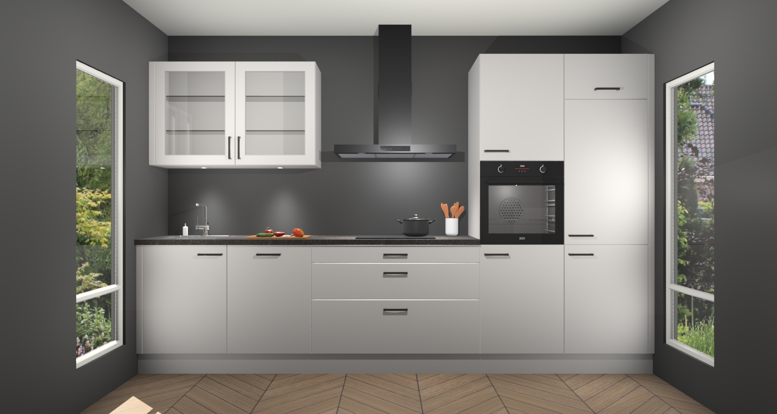 De zijdegrijs keuken Cairo is de perfecte mix van modern en tijdloos design. Met zijn prachtige glazen deuren op de bovenkastjes voegt hij echt iets speciaals en unieks toe aan elke keuken. En met vijf ingebouwde apparaten inbegrepen - een oven, inductiekookplaat, afzuigkap, vaatwasser en koelkast - kunt u deze keuken echt helemaal van uzelf maken! U kunt na bestelling ook upgraden naar AEG voor een nog hogere kwaliteitservaring.