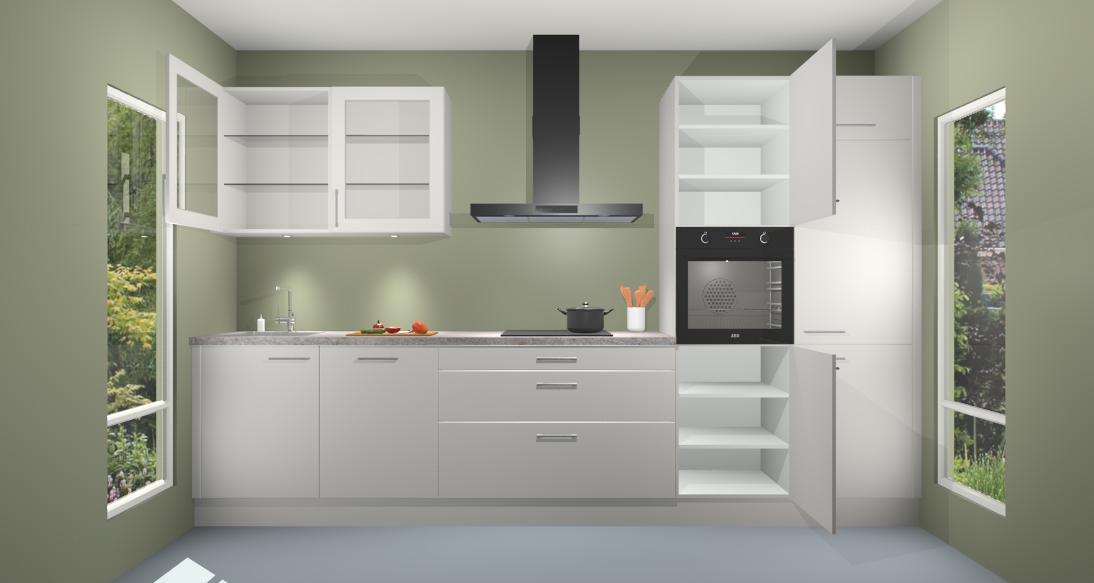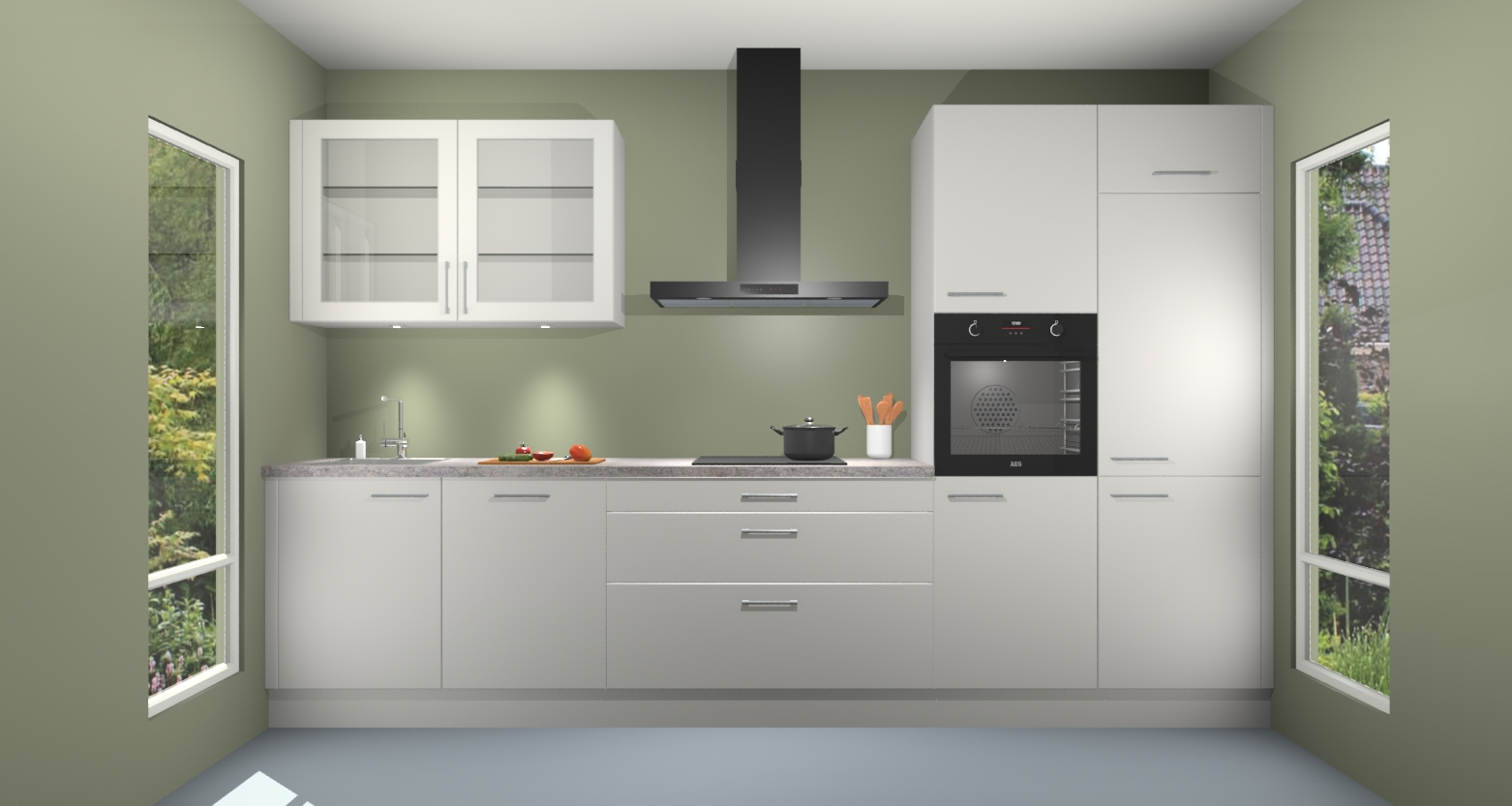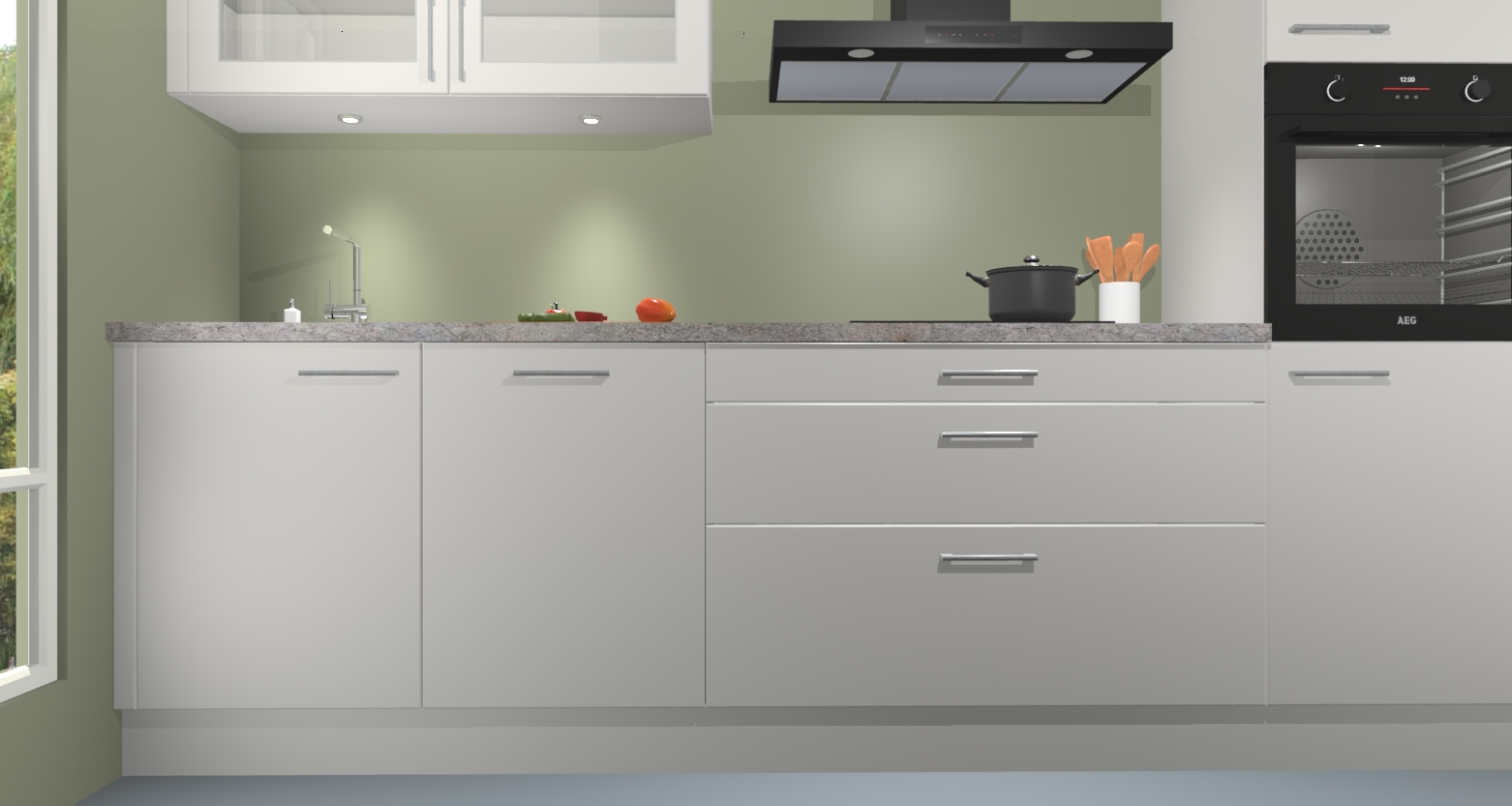 De zijdegrijs keuken Cairo is de perfecte mix van modern en tijdloos design. Met zijn prachtige glazen deuren op de bovenkastjes voegt hij echt iets speciaals en unieks toe aan elke keuken. En met vijf ingebouwde apparaten inbegrepen - een oven, inductiekookplaat, afzuigkap, vaatwasser en koelkast - kunt u deze keuken echt helemaal van uzelf maken! U kunt na bestelling ook upgraden naar AEG voor een nog hogere kwaliteitservaring.