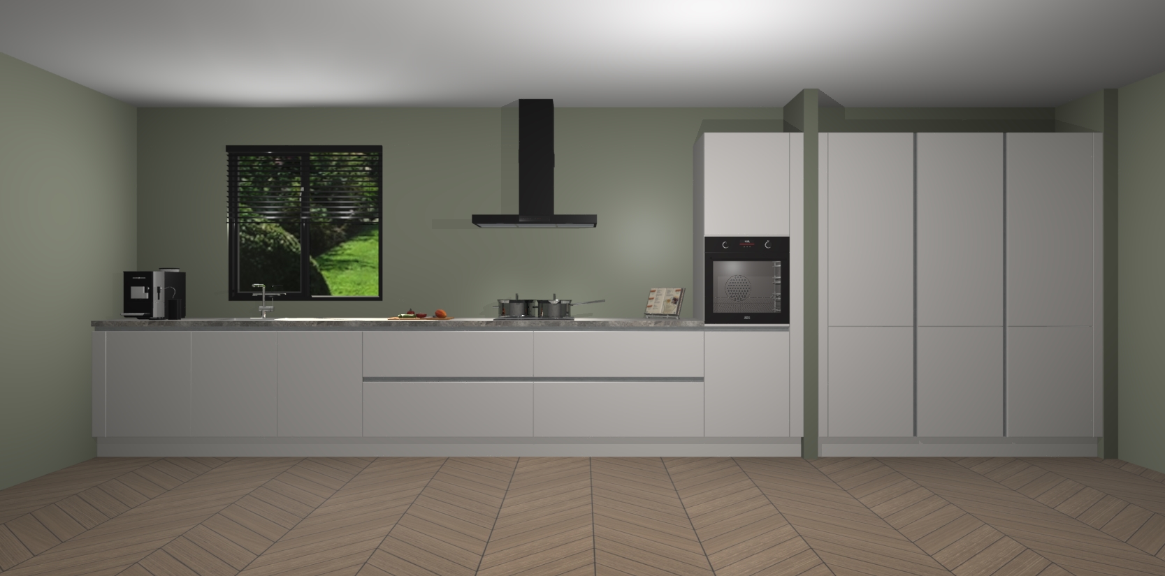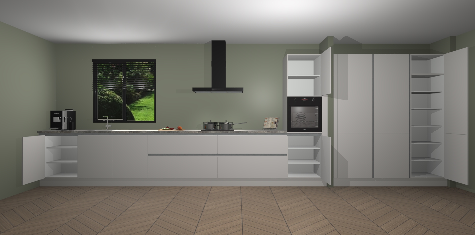 Een stijlvolle en praktische keuken als deze mag gezien worden. Dankzij de prachtige matte afwerking wordt de keuken gemakkelijk het middelpunt van uw huis - hij ziet er geweldig uit onder allerlei lichtomstandigheden, van dag tot nacht!