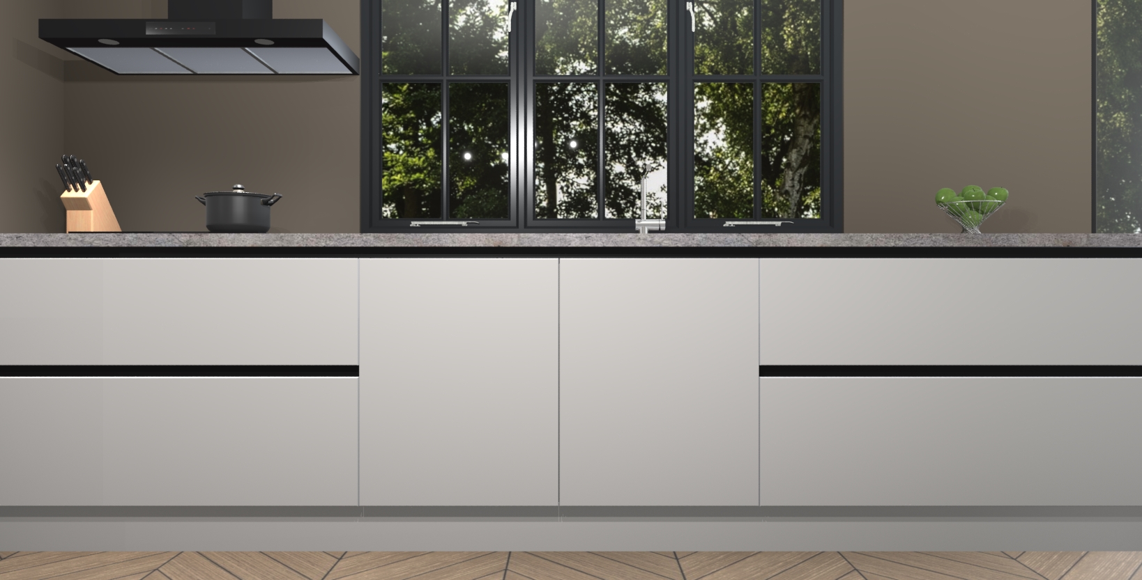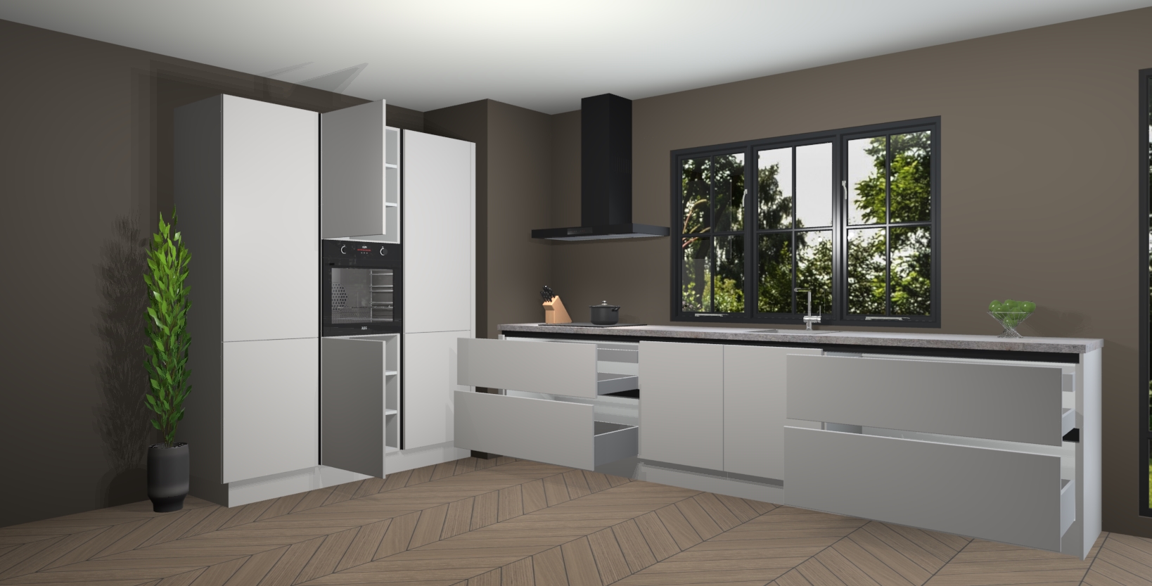De softclose deuren openen en sluiten is ook heel eenvoudig - geniet van een moeiteloze keukenervaring, zelfs als er kinderen rondlopen. Voor extra gemak bij het plaatsen van uw bestelling bieden we ook een upgrade naar een kookplaat met geïntegreerde afzuiging.