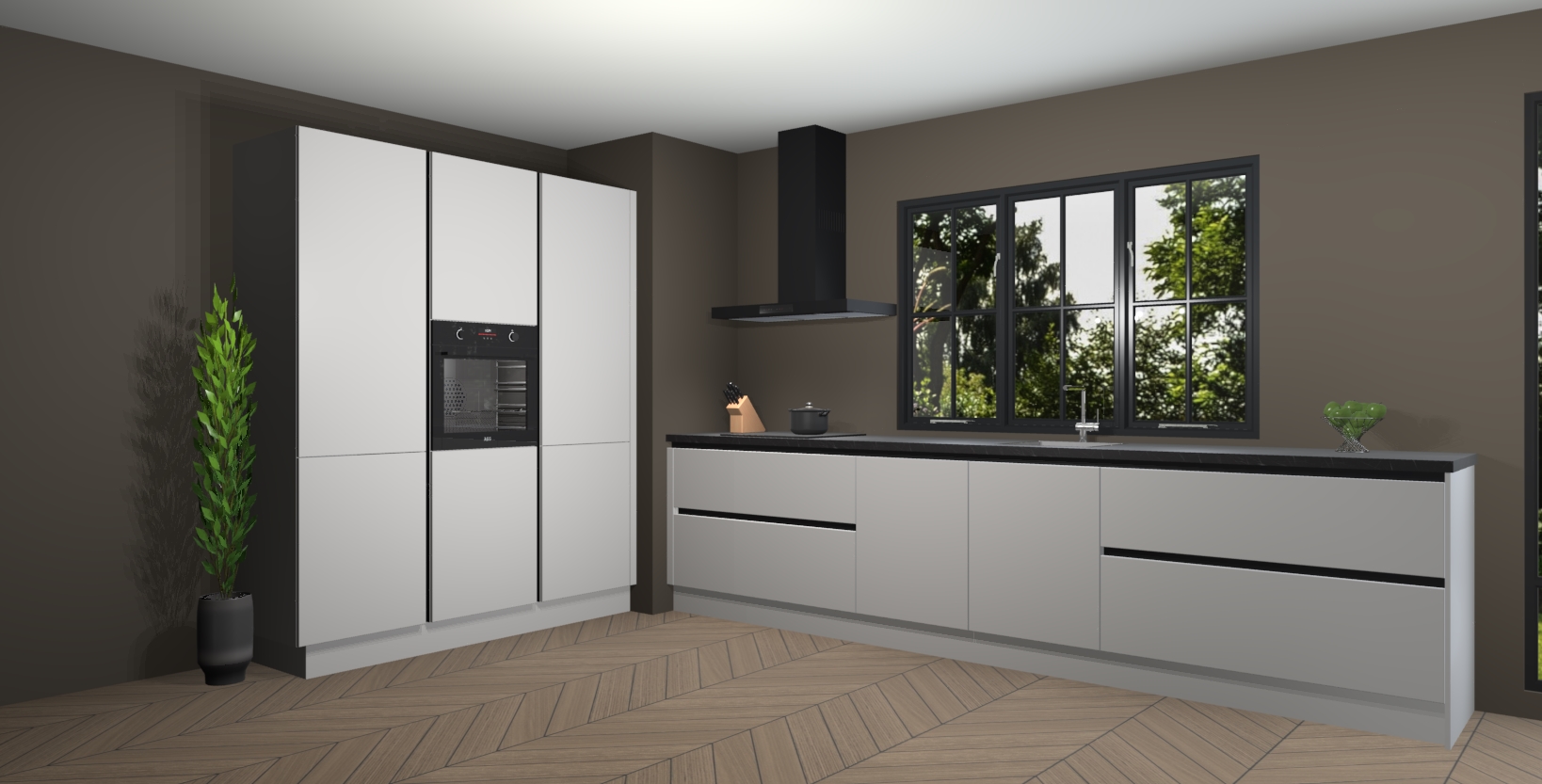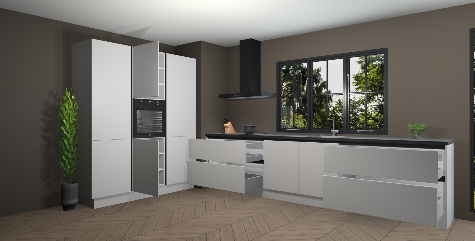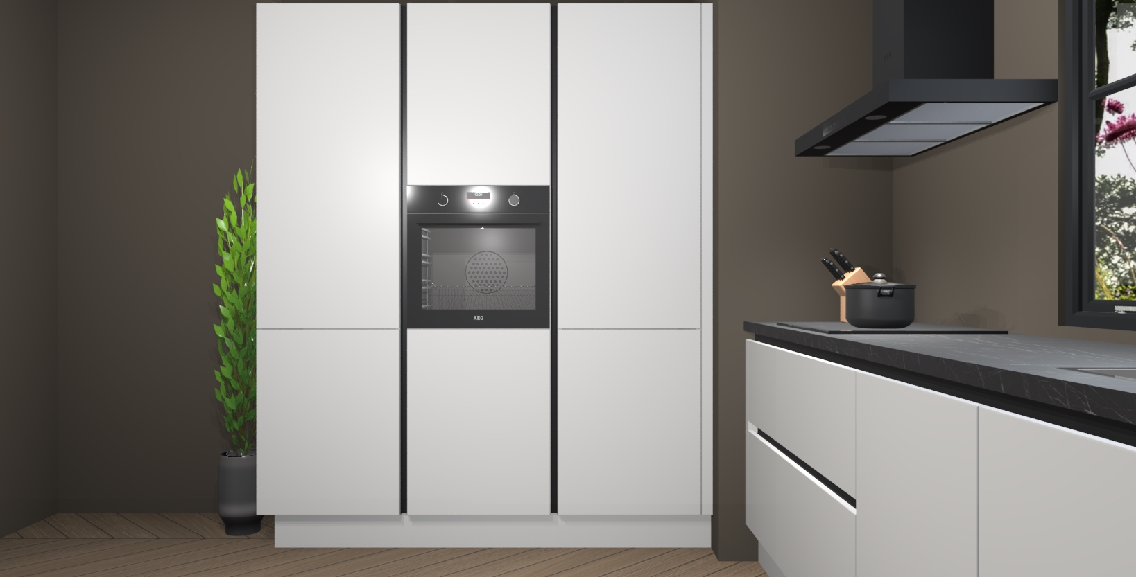 De softclose deuren openen en sluiten is ook heel eenvoudig - geniet van een moeiteloze keukenervaring, zelfs als er kinderen rondlopen. Voor extra gemak bij het plaatsen van uw bestelling bieden we ook een upgrade naar een kookplaat met geïntegreerde afzuiging.