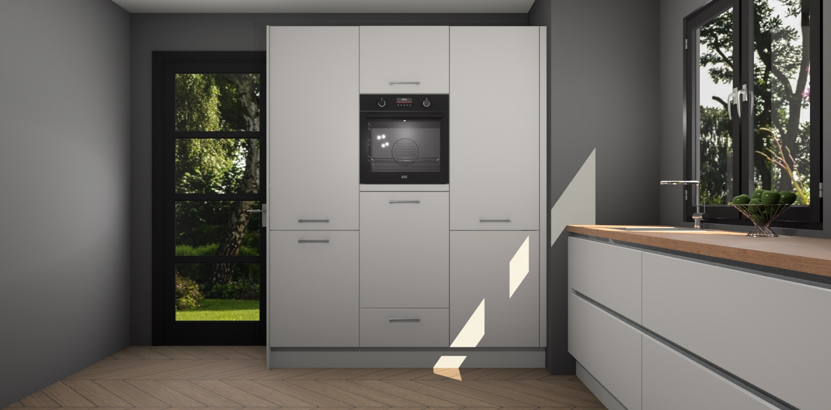 De softclose deuren openen en sluiten is ook heel eenvoudig - geniet van een moeiteloze keukenervaring, zelfs als er kinderen rondlopen. Voor extra gemak bij het plaatsen van uw bestelling bieden we ook een upgrade naar een kookplaat met geïntegreerde afzuiging.