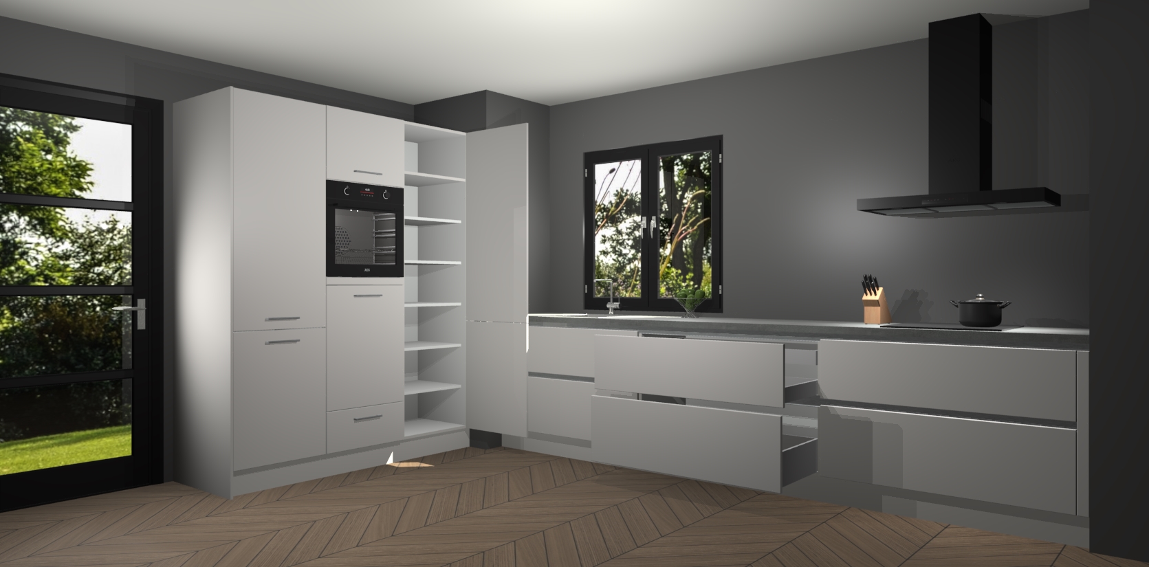 De softclose deuren openen en sluiten is ook heel eenvoudig - geniet van een moeiteloze keukenervaring, zelfs als er kinderen rondlopen. Voor extra gemak bij het plaatsen van uw bestelling bieden we ook een upgrade naar een kookplaat met geïntegreerde afzuiging.