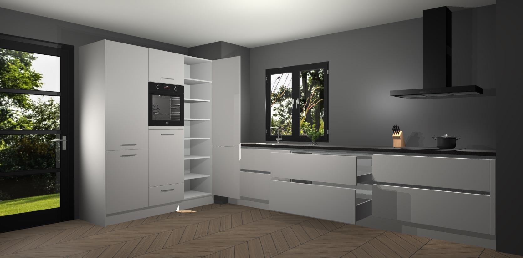 De softclose deuren openen en sluiten is ook heel eenvoudig - geniet van een moeiteloze keukenervaring, zelfs als er kinderen rondlopen. Voor extra gemak bij het plaatsen van uw bestelling bieden we ook een upgrade naar een kookplaat met geïntegreerde afzuiging.