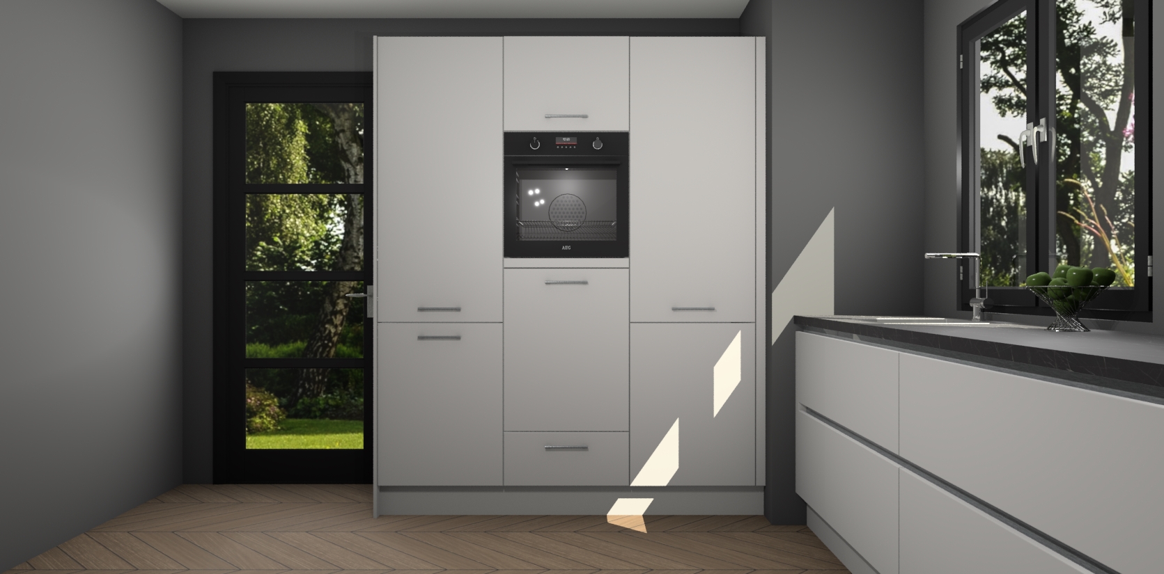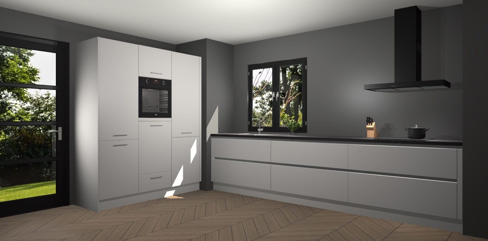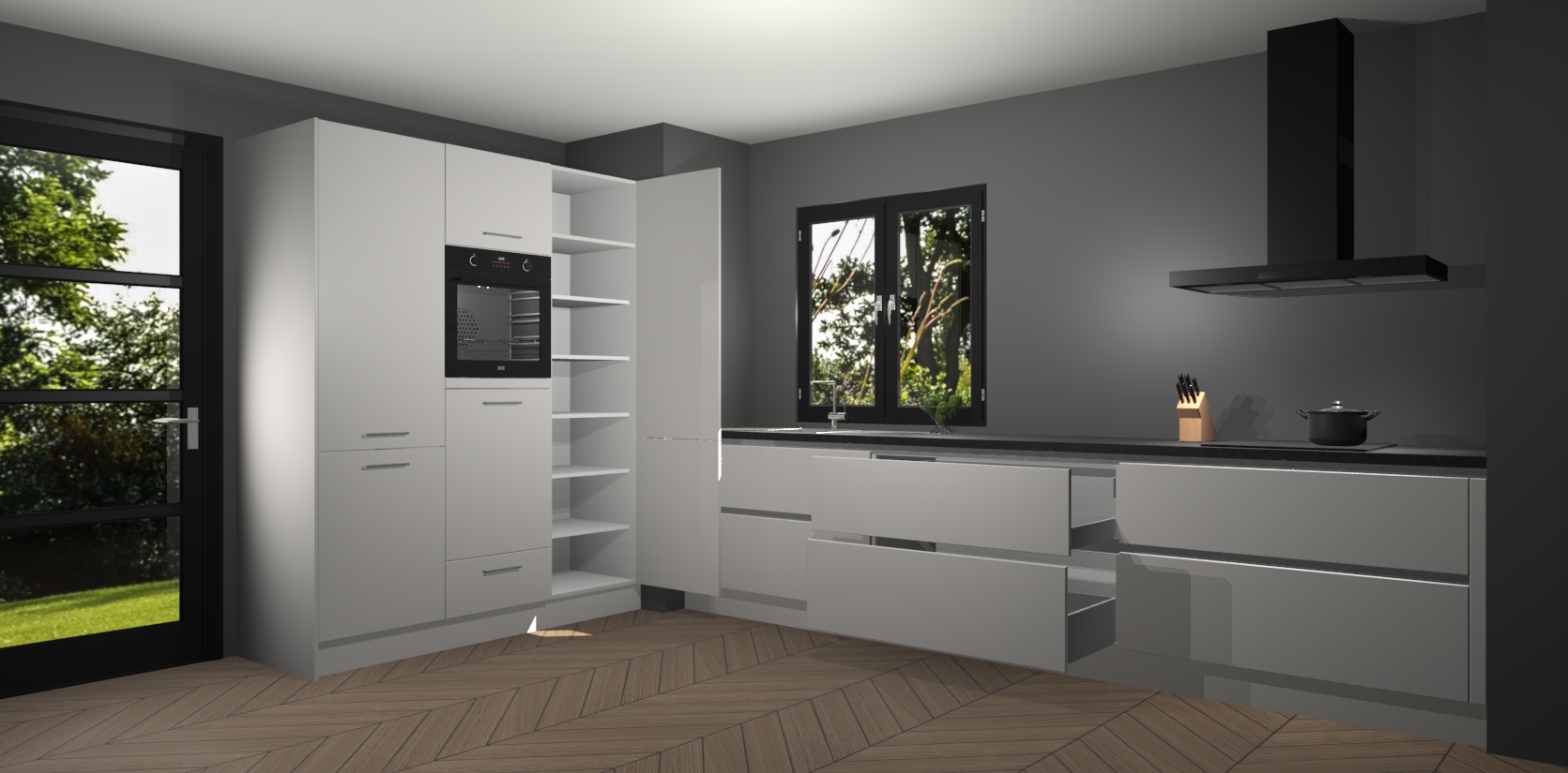 De softclose deuren openen en sluiten is ook heel eenvoudig - geniet van een moeiteloze keukenervaring, zelfs als er kinderen rondlopen. Voor extra gemak bij het plaatsen van uw bestelling bieden we ook een upgrade naar een kookplaat met geïntegreerde afzuiging.
