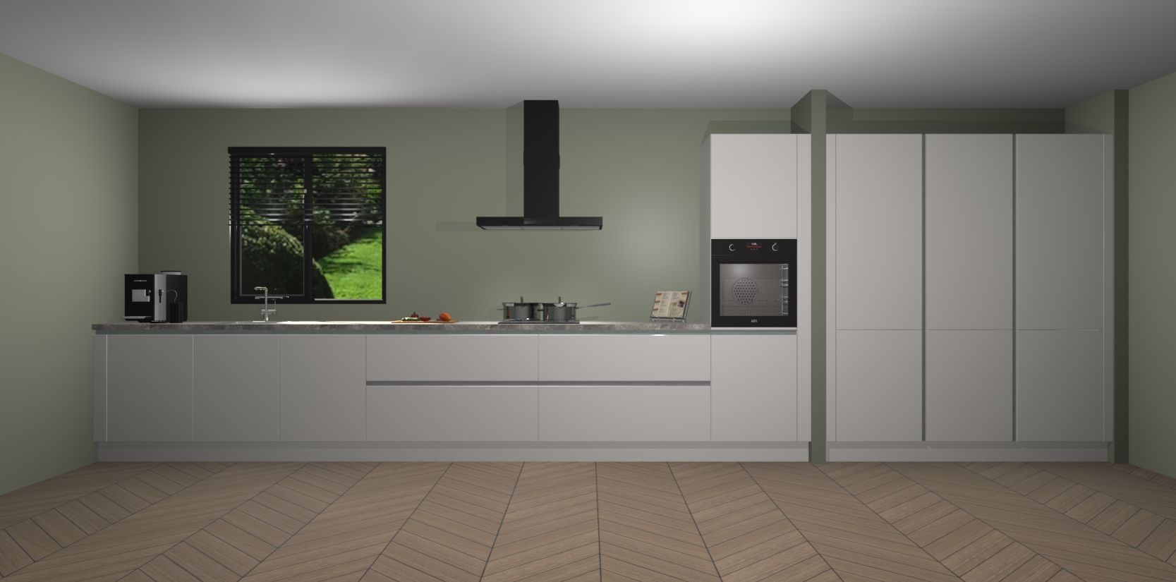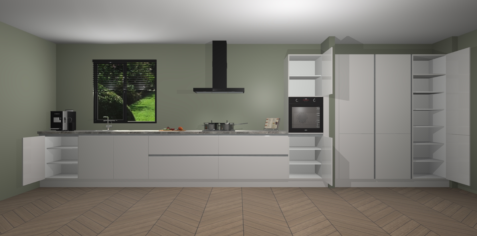 Een stijlvolle en praktische keuken als deze mag gezien worden. Dankzij de prachtige matte afwerking wordt de keuken gemakkelijk het middelpunt van uw huis - hij ziet er geweldig uit onder allerlei lichtomstandigheden, van dag tot nacht!