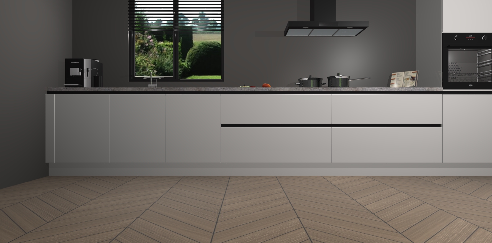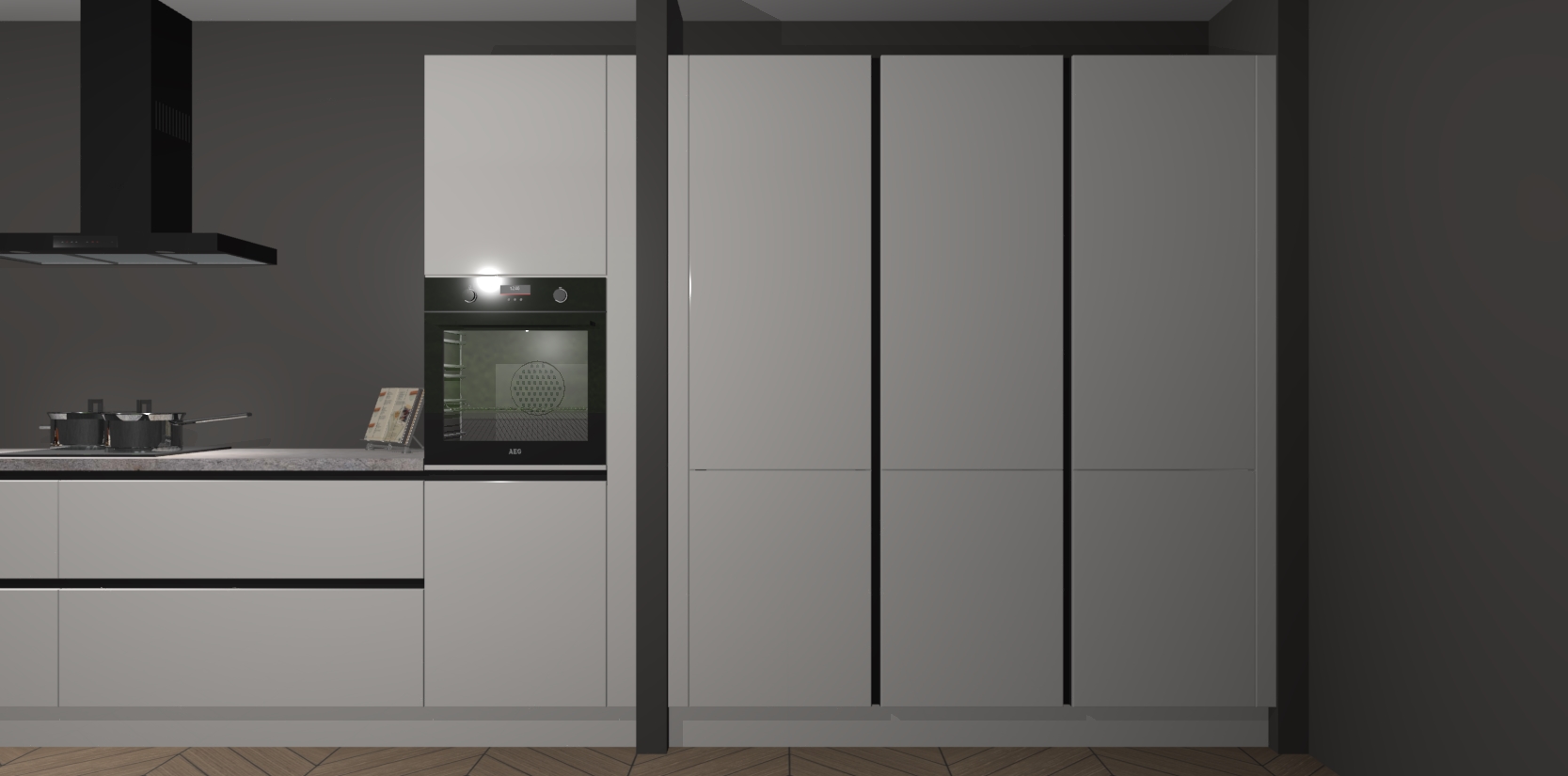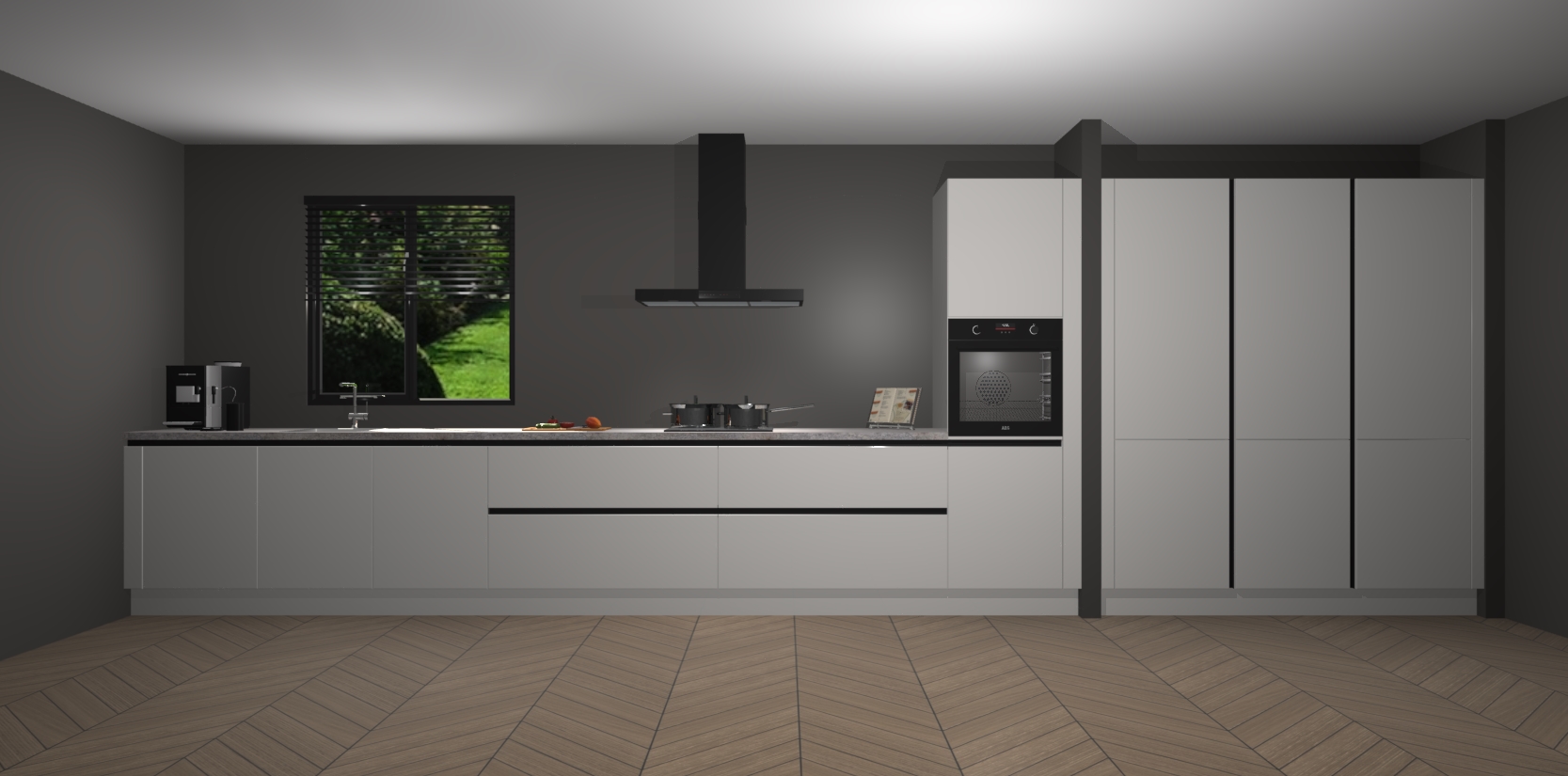 Een stijlvolle en praktische keuken als deze mag gezien worden. Dankzij de prachtige matte afwerking wordt de keuken gemakkelijk het middelpunt van uw huis - hij ziet er geweldig uit onder allerlei lichtomstandigheden, van dag tot nacht!