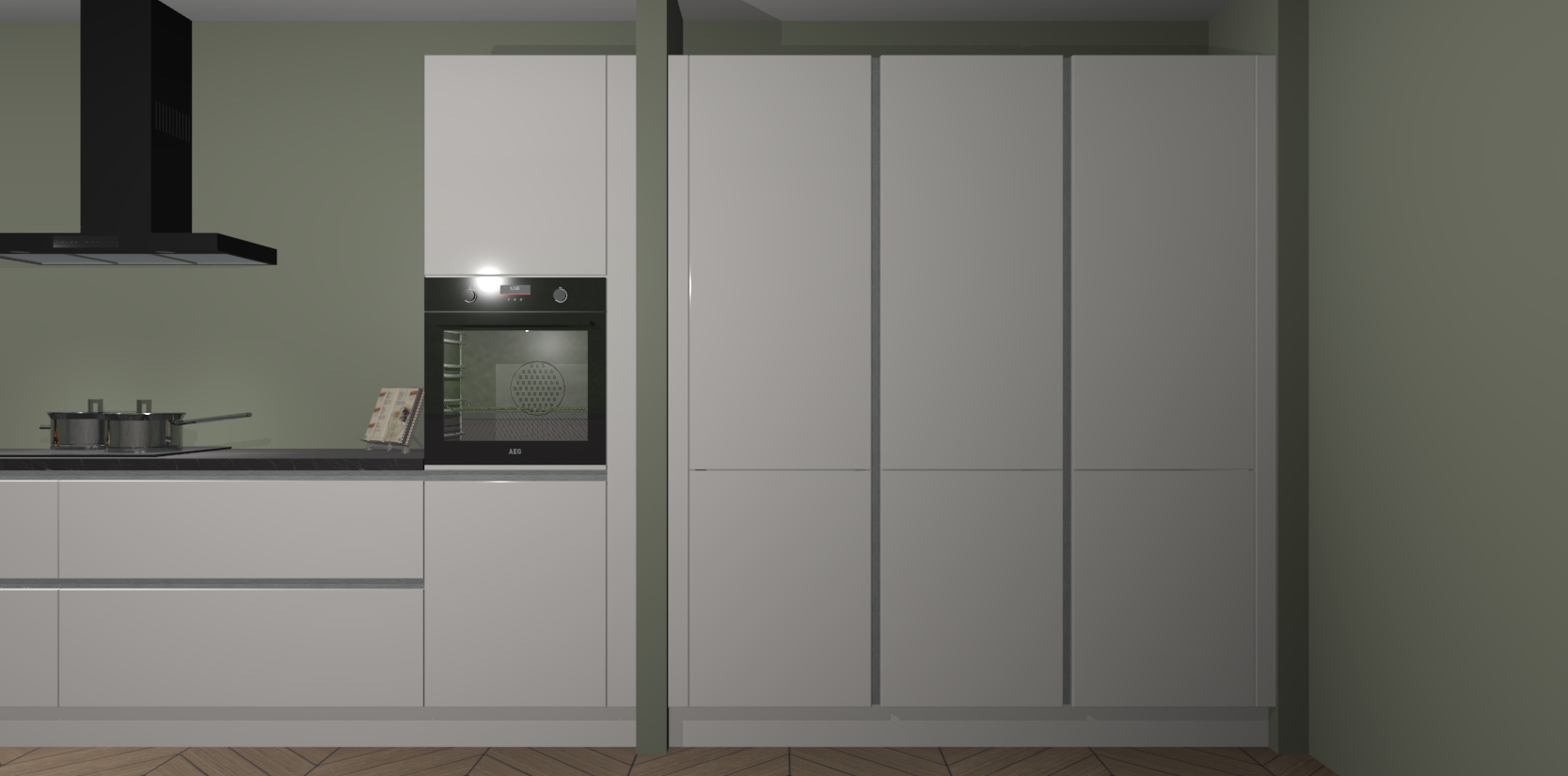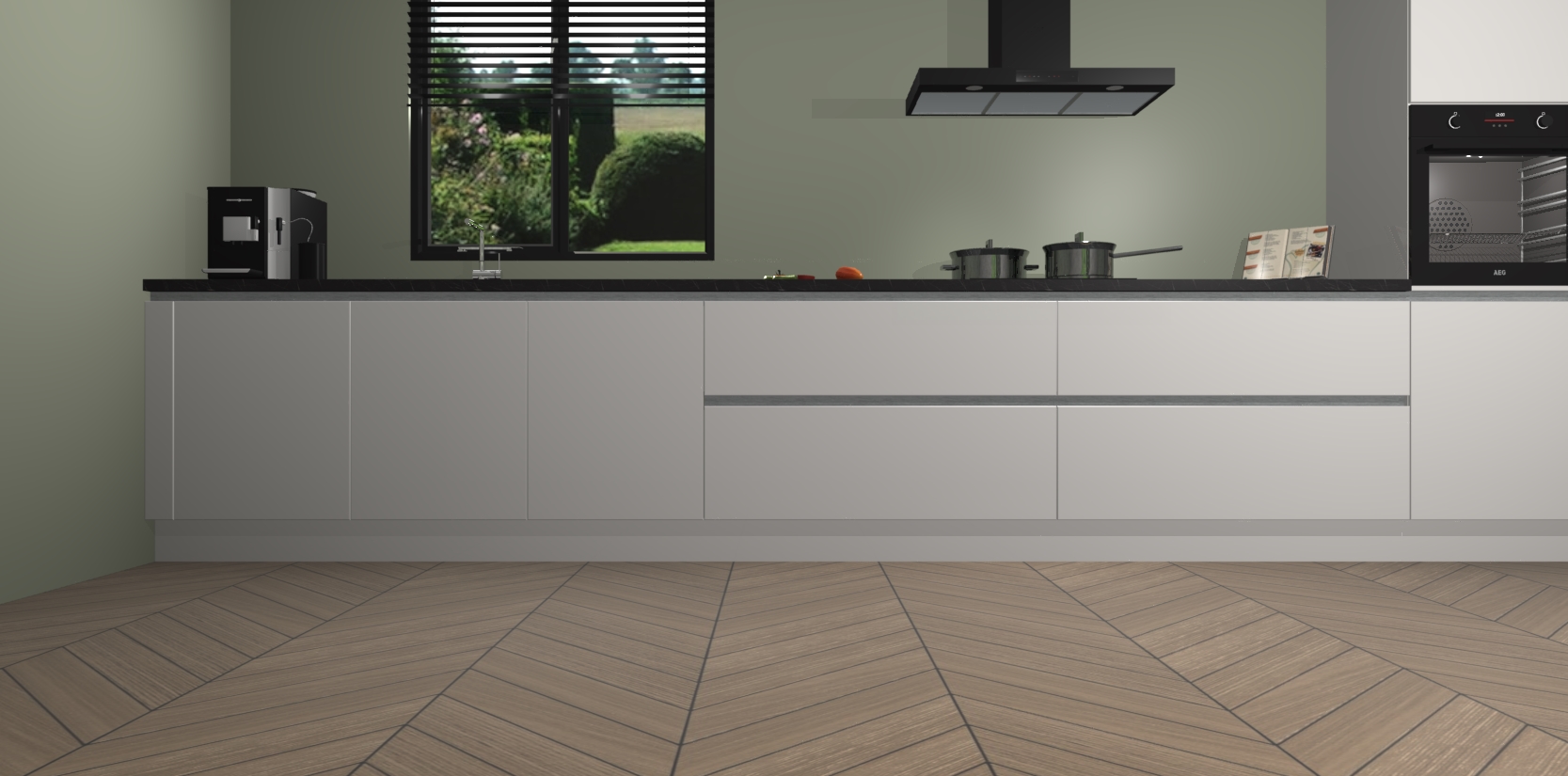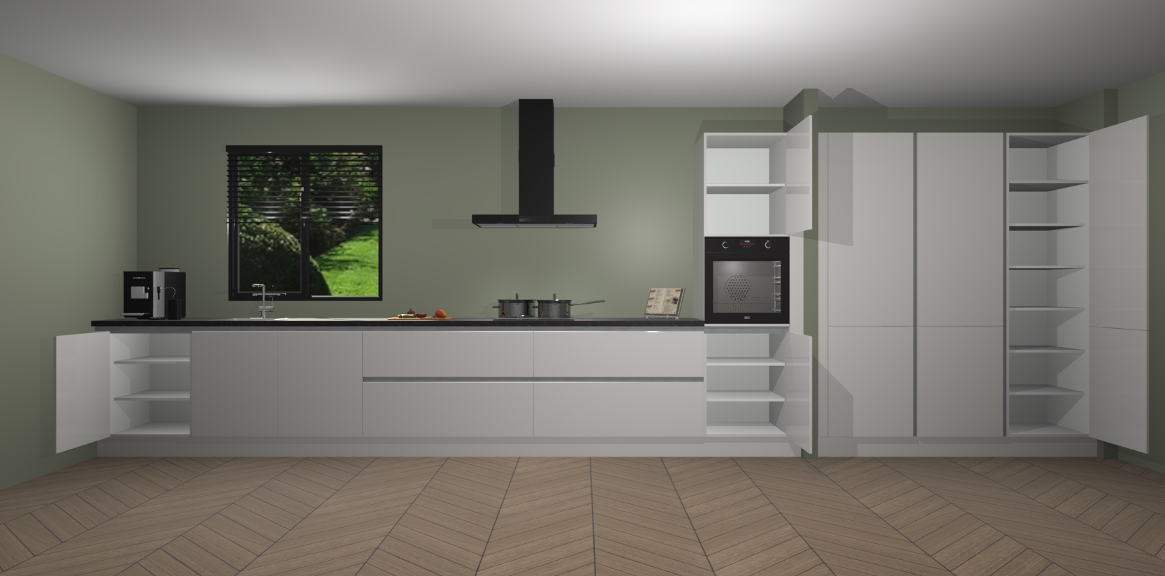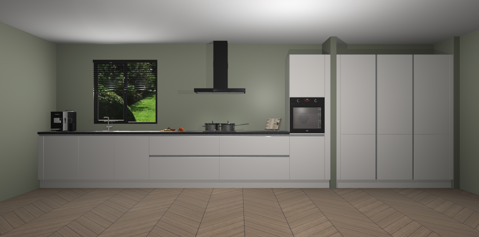 Een stijlvolle en praktische keuken als deze mag gezien worden. Dankzij de prachtige matte afwerking wordt de keuken gemakkelijk het middelpunt van uw huis - hij ziet er geweldig uit onder allerlei lichtomstandigheden, van dag tot nacht!