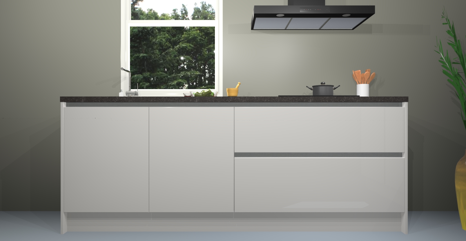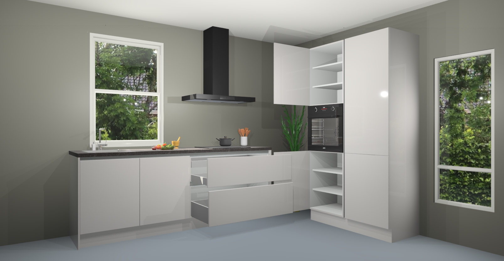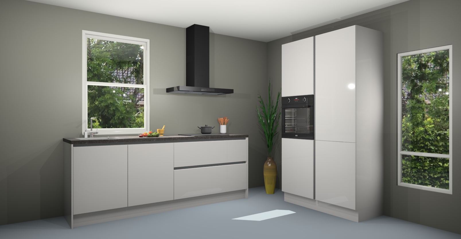 De Zijdegrijze hoogglans greeploze keuken Monaco heeft voldoende opbergruimte om uw keukenbenodigdheden georganiseerd en netjes te houden. Geniet van het gemak van de soft-close deuren, die deze stijlvolle look perfect afmaken. Maar dat is nog niet alles. Met de Zijdegrijze hoogglans greeploze keuken Monaco krijgt u maar liefst 5 ingebouwde apparaten: een oven, inductiekookplaat, afzuigkap, vaatwasser en koelkast. Deze kunnen gemakkelijk worden geüpgraded naar AEG als ze besteld zijn.