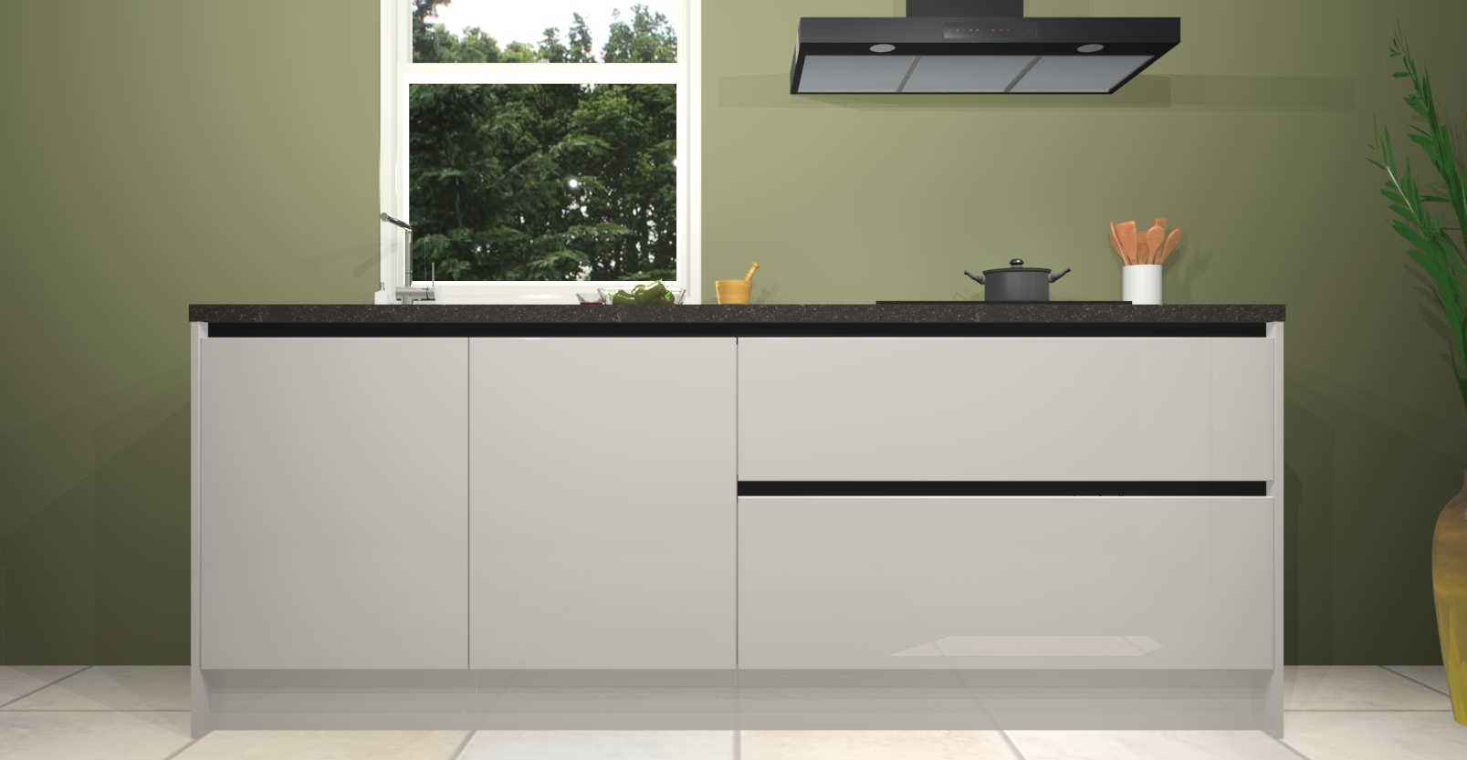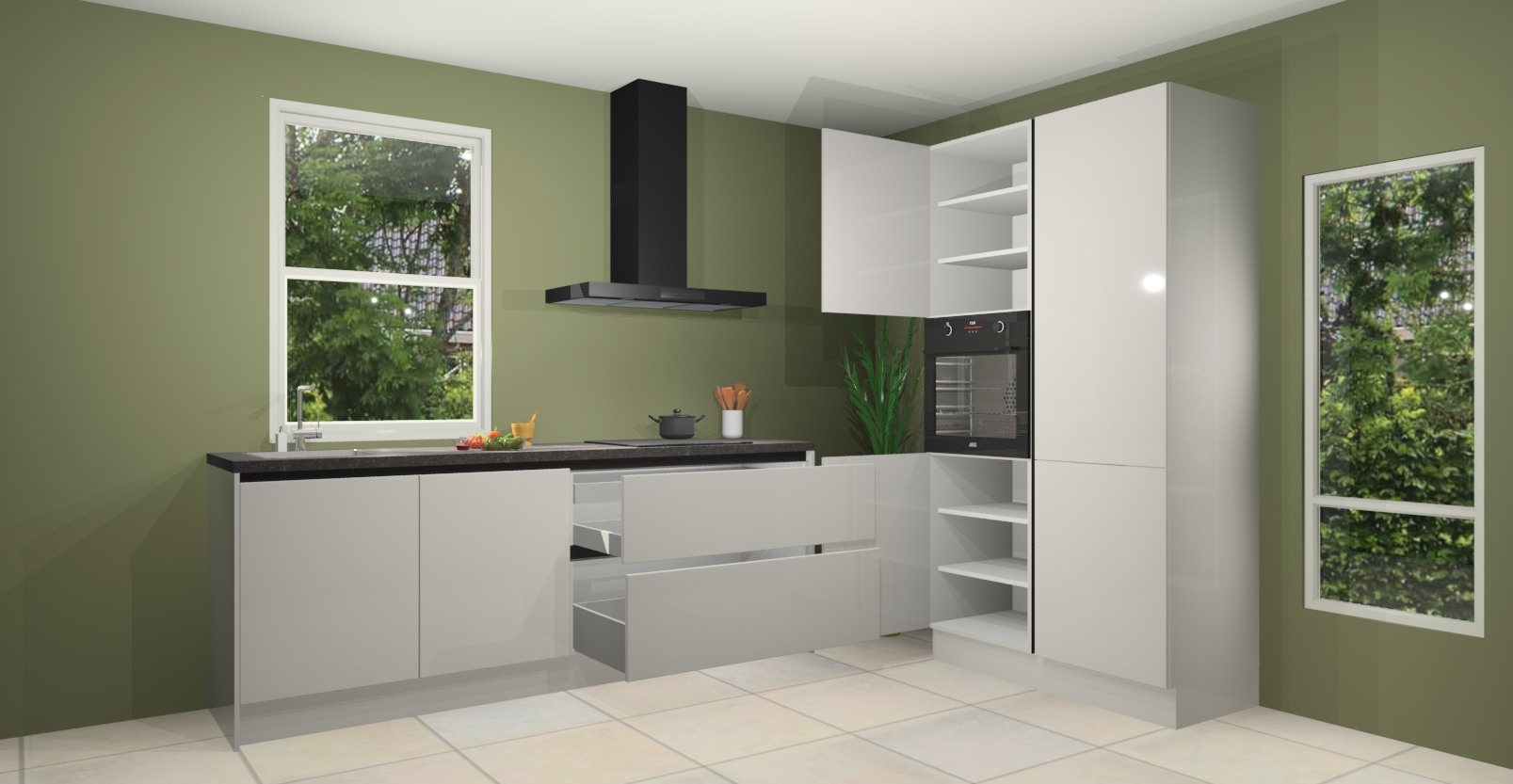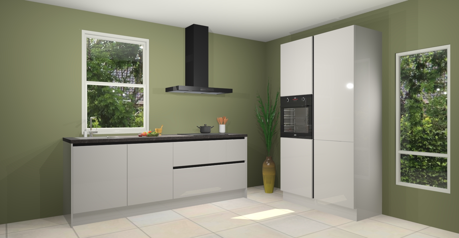 De Zijdegrijze hoogglans greeploze keuken Monaco heeft voldoende opbergruimte om uw keukenbenodigdheden georganiseerd en netjes te houden. Geniet van het gemak van de soft-close deuren, die deze stijlvolle look perfect afmaken. Maar dat is nog niet alles. Met de Zijdegrijze hoogglans greeploze keuken Monaco krijgt u maar liefst 5 ingebouwde apparaten: een oven, inductiekookplaat, afzuigkap, vaatwasser en koelkast. Deze kunnen gemakkelijk worden geüpgraded naar AEG als ze besteld zijn.