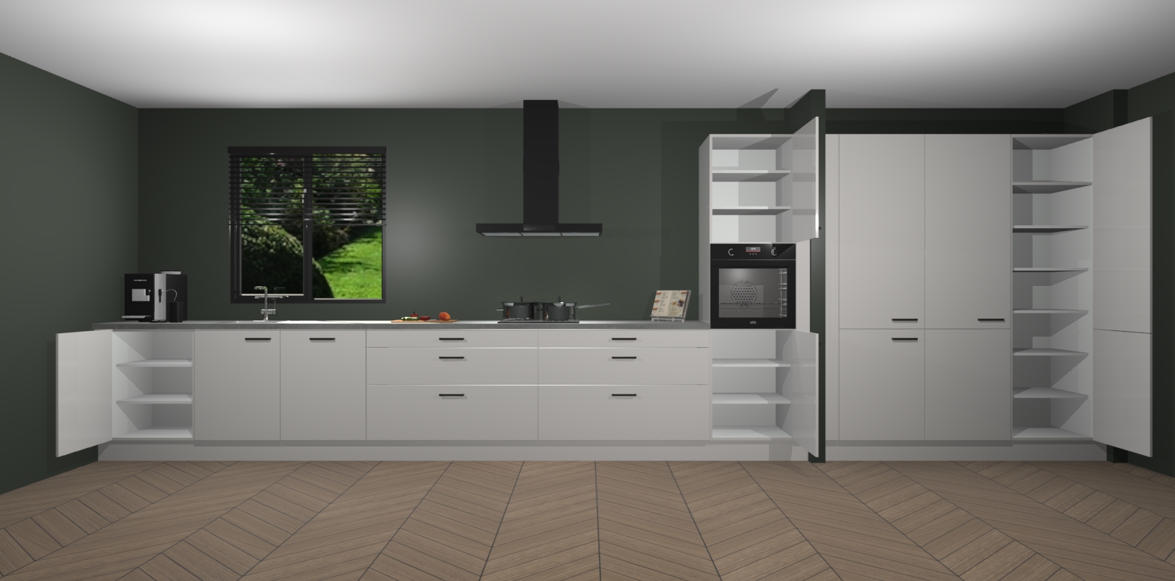 Een stijlvolle en praktische keuken als deze mag gezien worden. Dankzij de prachtige matte afwerking wordt de keuken gemakkelijk het middelpunt van uw huis - hij ziet er geweldig uit onder allerlei lichtomstandigheden, van dag tot nacht!