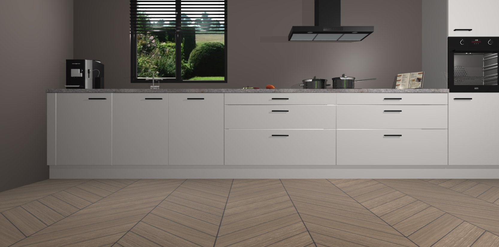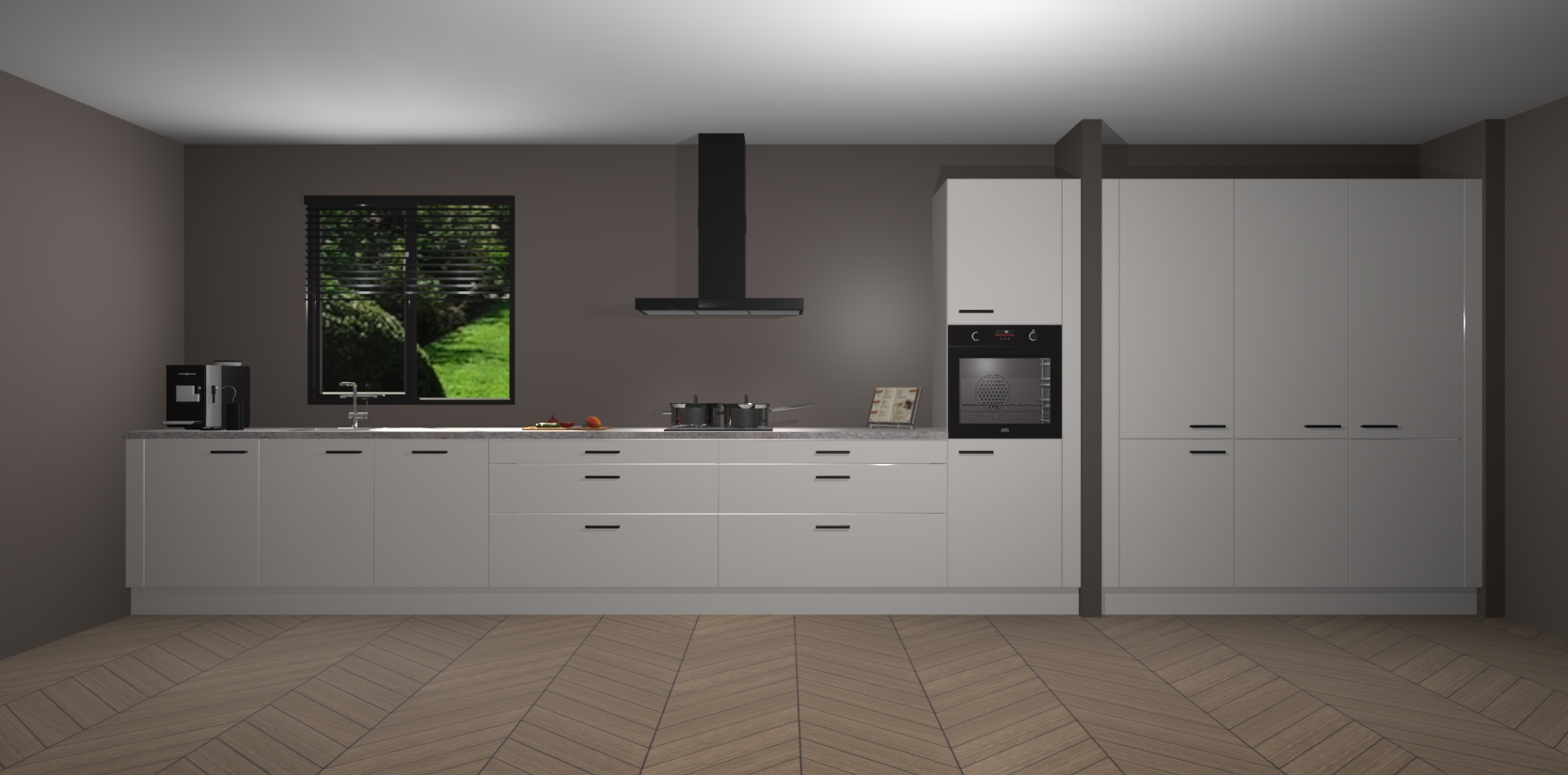 Een stijlvolle en praktische keuken als deze mag gezien worden. Dankzij de prachtige matte afwerking wordt de keuken gemakkelijk het middelpunt van uw huis - hij ziet er geweldig uit onder allerlei lichtomstandigheden, van dag tot nacht!
