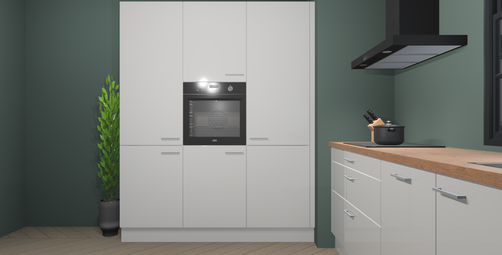 De softclose deuren openen en sluiten is ook heel eenvoudig - geniet van een moeiteloze keukenervaring, zelfs als er kinderen rondlopen. Voor extra gemak bij het plaatsen van uw bestelling bieden we ook een upgrade naar een kookplaat met geïntegreerde afzuiging.