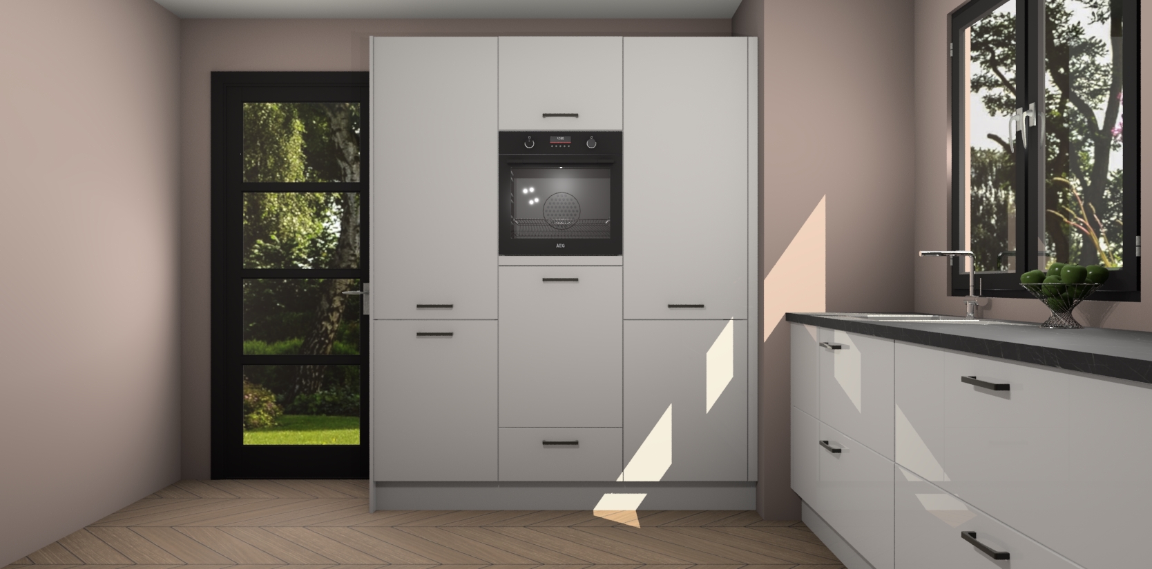 De softclose deuren openen en sluiten is ook heel eenvoudig - geniet van een moeiteloze keukenervaring, zelfs als er kinderen rondlopen. Voor extra gemak bij het plaatsen van uw bestelling bieden we ook een upgrade naar een kookplaat met geïntegreerde afzuiging.