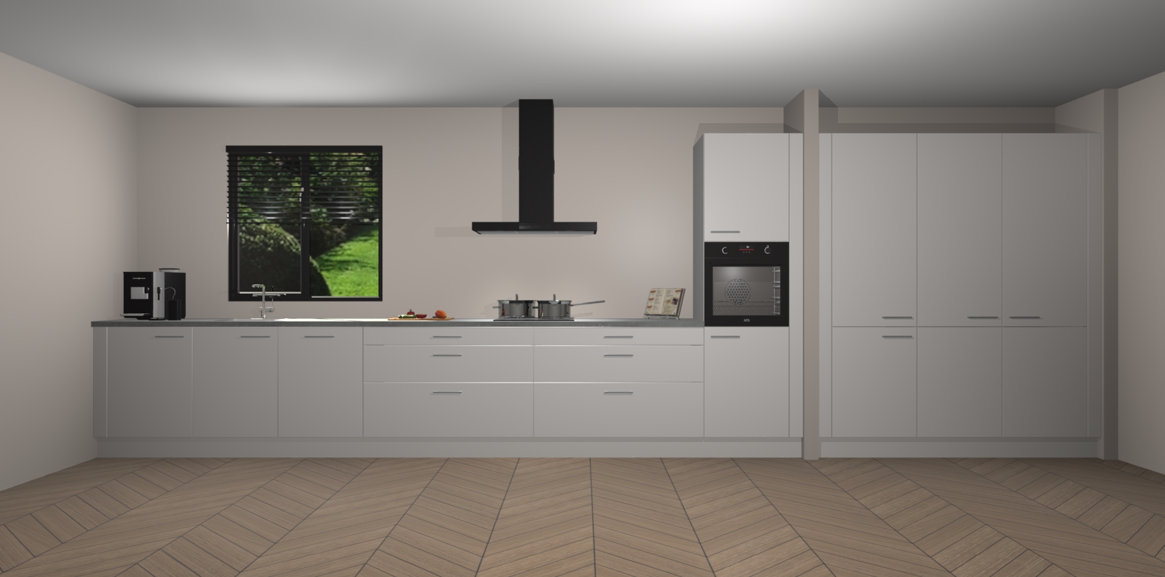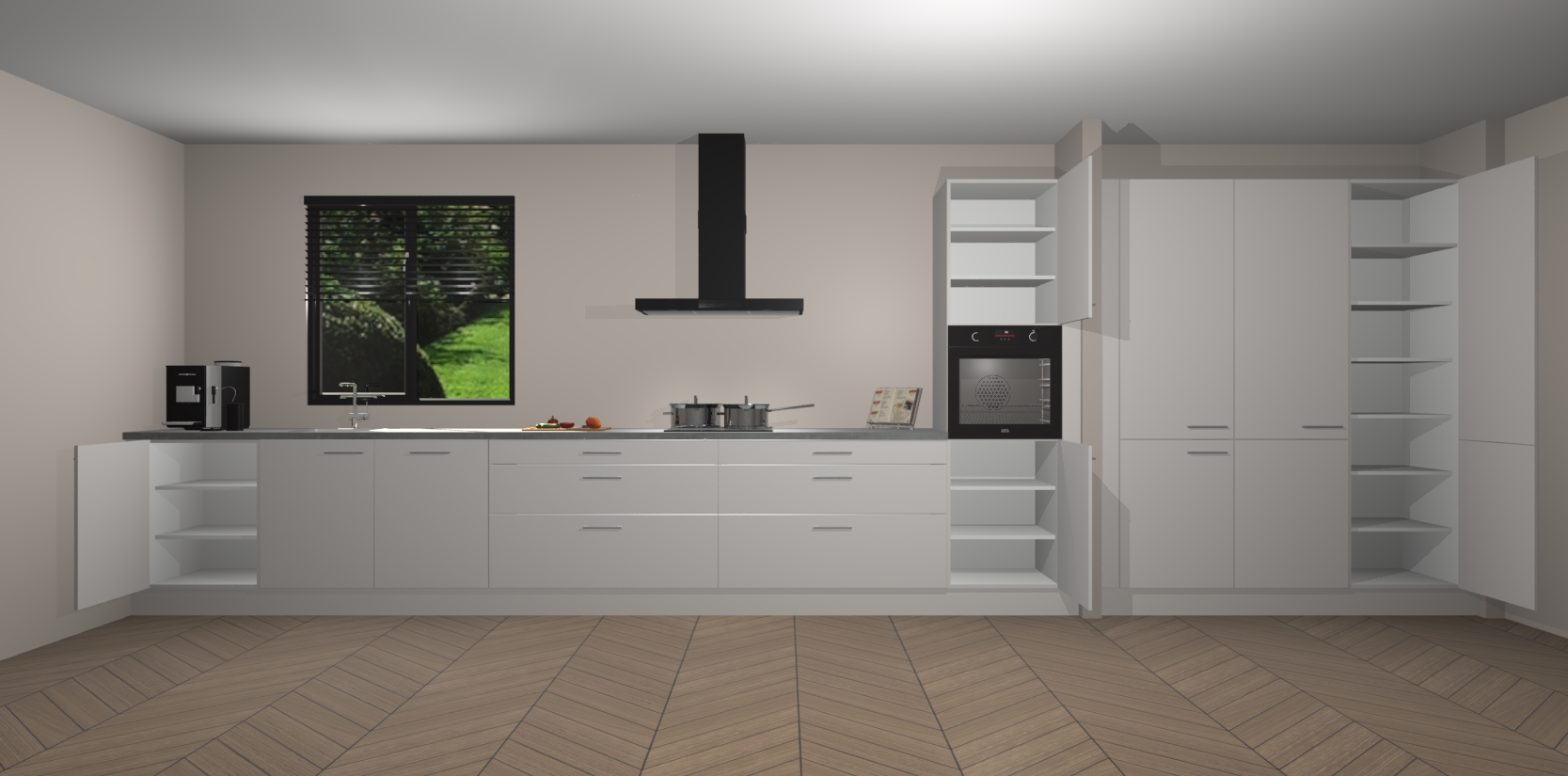Een stijlvolle en praktische keuken als deze mag gezien worden. Dankzij de prachtige matte afwerking wordt de keuken gemakkelijk het middelpunt van uw huis - hij ziet er geweldig uit onder allerlei lichtomstandigheden, van dag tot nacht!