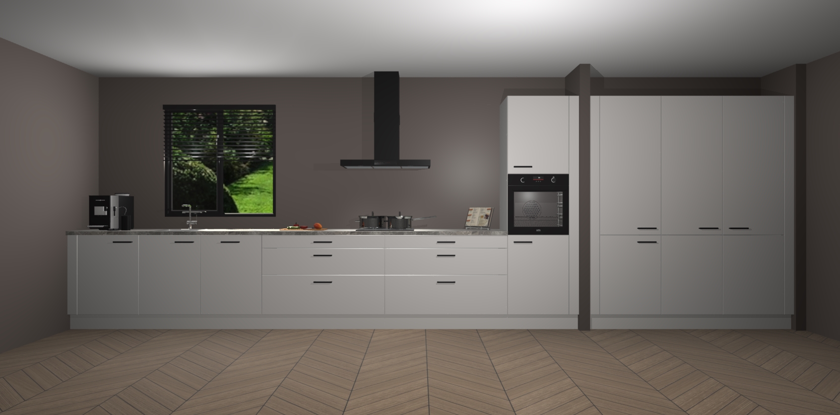 Een stijlvolle en praktische keuken als deze mag gezien worden. Dankzij de prachtige matte afwerking wordt de keuken gemakkelijk het middelpunt van uw huis - hij ziet er geweldig uit onder allerlei lichtomstandigheden, van dag tot nacht!