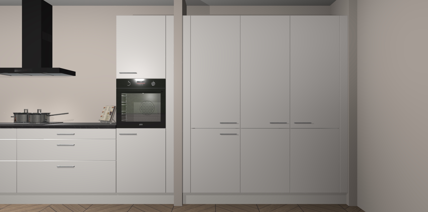 Een stijlvolle en praktische keuken als deze mag gezien worden. Dankzij de prachtige matte afwerking wordt de keuken gemakkelijk het middelpunt van uw huis - hij ziet er geweldig uit onder allerlei lichtomstandigheden, van dag tot nacht!