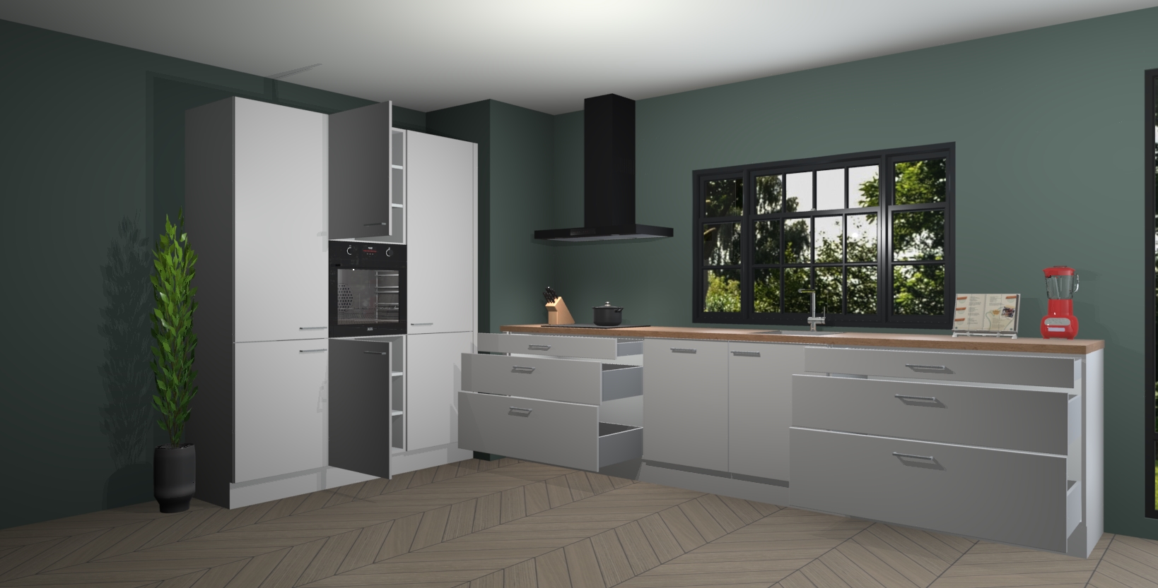 De softclose deuren openen en sluiten is ook heel eenvoudig - geniet van een moeiteloze keukenervaring, zelfs als er kinderen rondlopen. Voor extra gemak bij het plaatsen van uw bestelling bieden we ook een upgrade naar een kookplaat met geïntegreerde afzuiging.