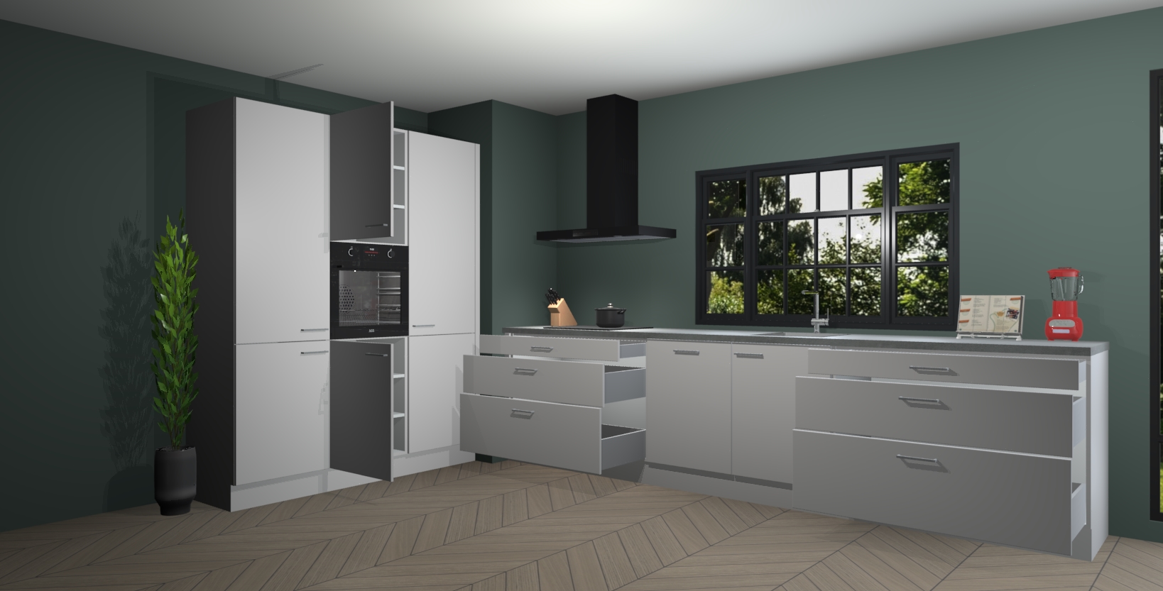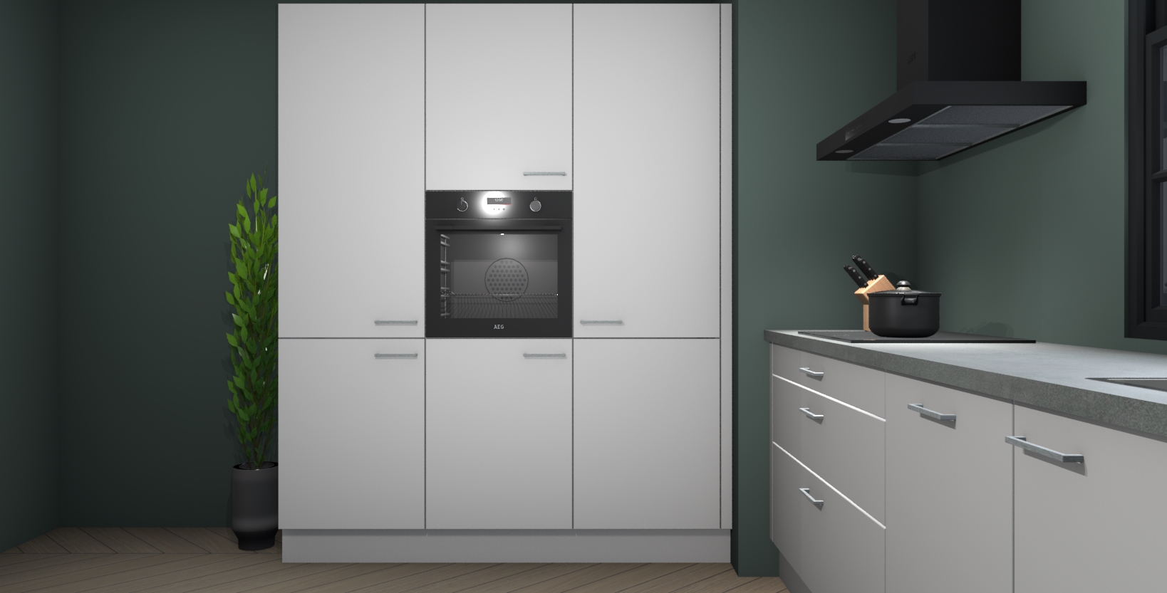 De softclose deuren openen en sluiten is ook heel eenvoudig - geniet van een moeiteloze keukenervaring, zelfs als er kinderen rondlopen. Voor extra gemak bij het plaatsen van uw bestelling bieden we ook een upgrade naar een kookplaat met geïntegreerde afzuiging.