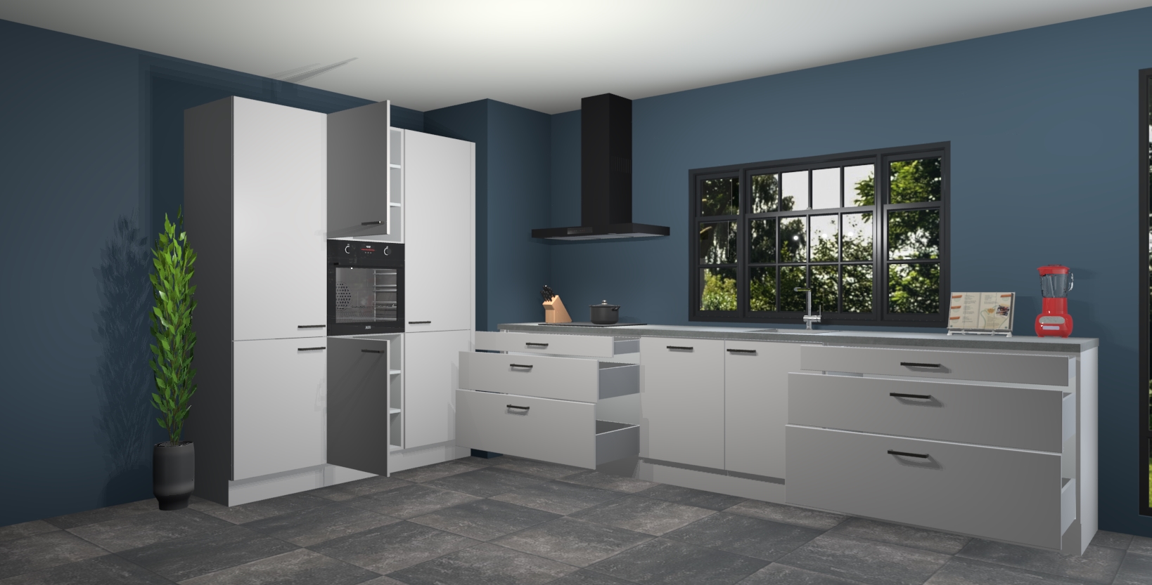 De softclose deuren openen en sluiten is ook heel eenvoudig - geniet van een moeiteloze keukenervaring, zelfs als er kinderen rondlopen. Voor extra gemak bij het plaatsen van uw bestelling bieden we ook een upgrade naar een kookplaat met geïntegreerde afzuiging.