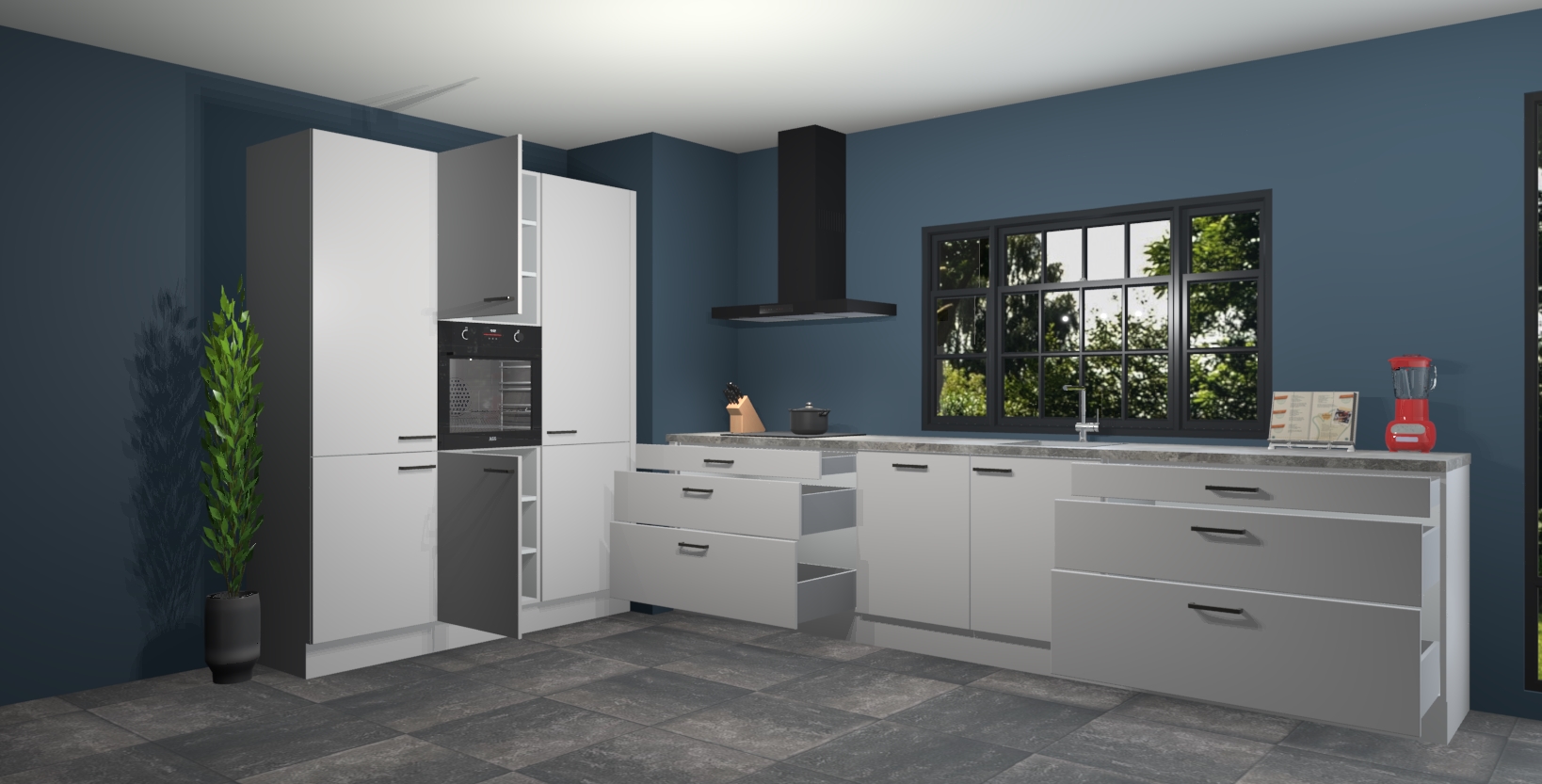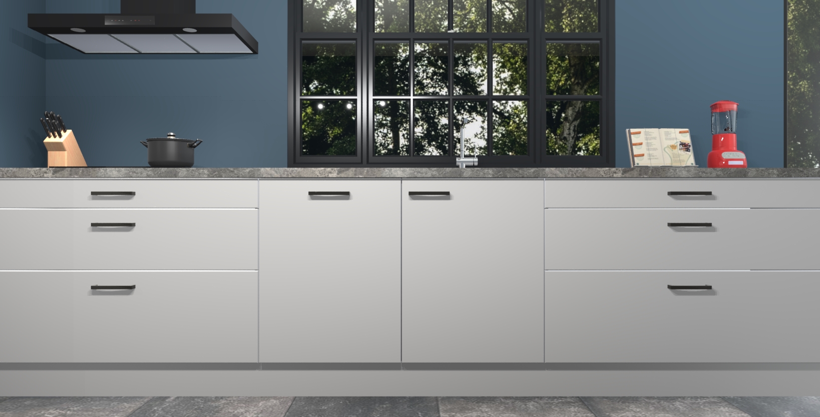 De softclose deuren openen en sluiten is ook heel eenvoudig - geniet van een moeiteloze keukenervaring, zelfs als er kinderen rondlopen. Voor extra gemak bij het plaatsen van uw bestelling bieden we ook een upgrade naar een kookplaat met geïntegreerde afzuiging.