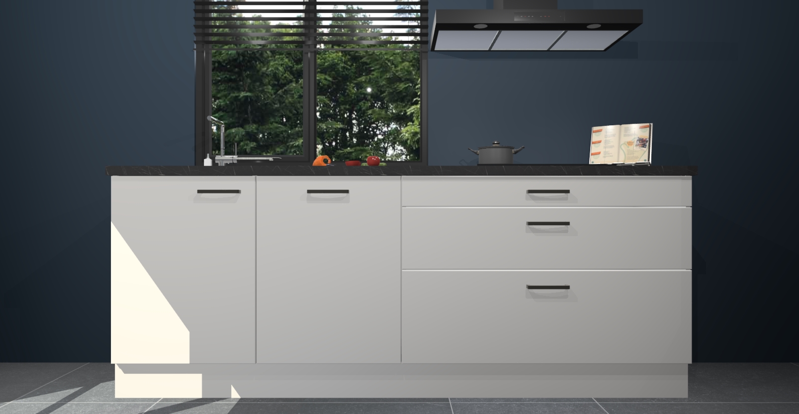 De setting is compleet gemaakt door de vijf inbouwapparaten: wanneer u gaat bestellen kunt u upgraden naar AEG-apparaten als oven, inductieplaat, afzuigkap, vaatwasser en koelkast. Kiest u voor onze Zijdegrijze keuken Monaco, dan weet u zeker dat u te maken heeft met Duitse kwaliteit. Bovendien is er altijd sprake van een lage prijs en profiteren we aantrekkelijk leveringstermijn: die bedraagt slechts 7 weken ! Om het extra makkelijk te maken worden de keukenkasten reeds voorgemonteerd geleverd.