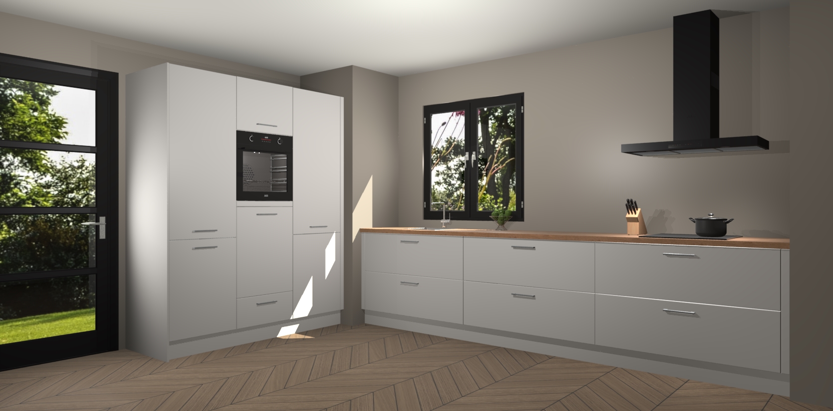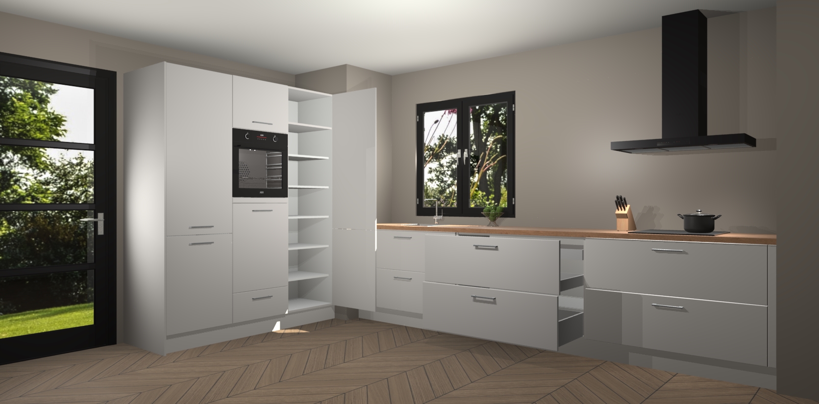 De softclose deuren openen en sluiten is ook heel eenvoudig - geniet van een moeiteloze keukenervaring, zelfs als er kinderen rondlopen. Voor extra gemak bij het plaatsen van uw bestelling bieden we ook een upgrade naar een kookplaat met geïntegreerde afzuiging.