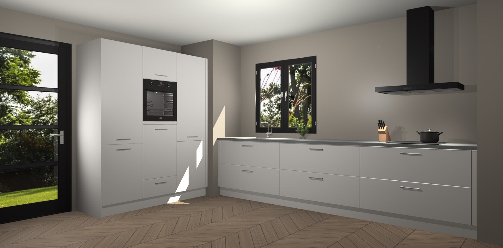 De softclose deuren openen en sluiten is ook heel eenvoudig - geniet van een moeiteloze keukenervaring, zelfs als er kinderen rondlopen. Voor extra gemak bij het plaatsen van uw bestelling bieden we ook een upgrade naar een kookplaat met geïntegreerde afzuiging.