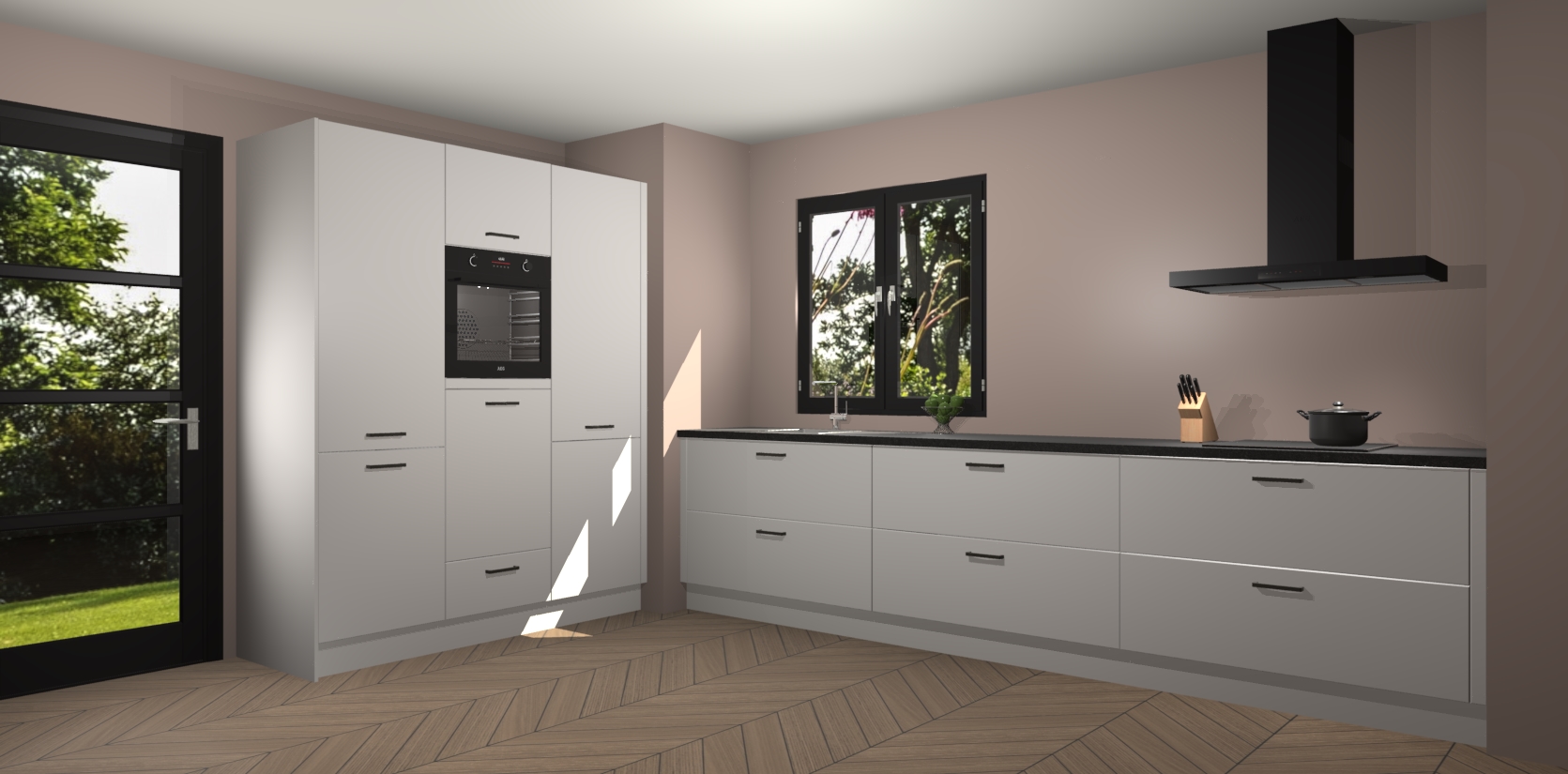 De softclose deuren openen en sluiten is ook heel eenvoudig - geniet van een moeiteloze keukenervaring, zelfs als er kinderen rondlopen. Voor extra gemak bij het plaatsen van uw bestelling bieden we ook een upgrade naar een kookplaat met geïntegreerde afzuiging.