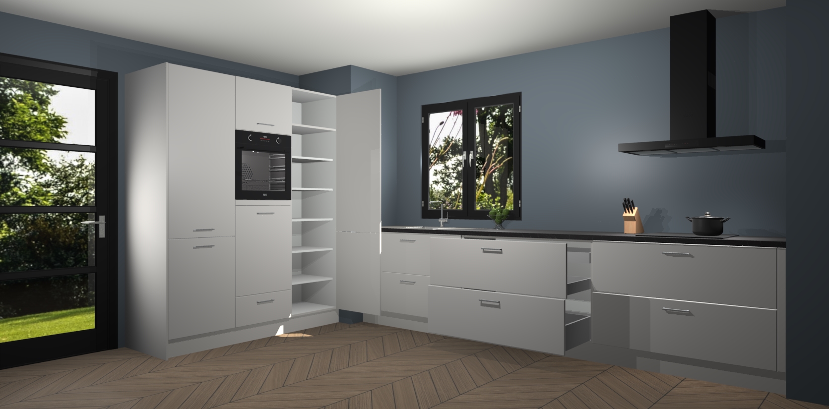 De softclose deuren openen en sluiten is ook heel eenvoudig - geniet van een moeiteloze keukenervaring, zelfs als er kinderen rondlopen. Voor extra gemak bij het plaatsen van uw bestelling bieden we ook een upgrade naar een kookplaat met geïntegreerde afzuiging.