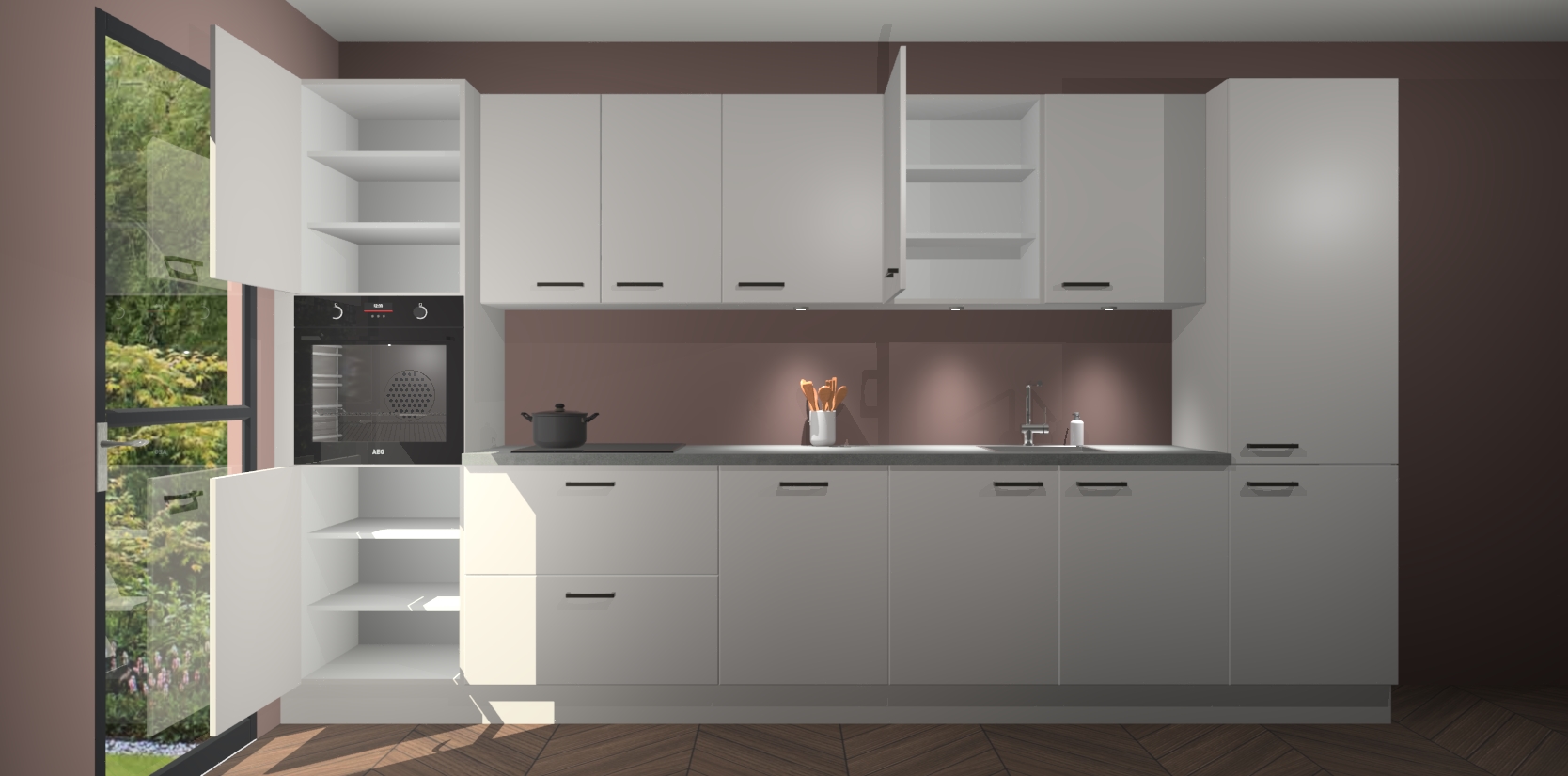 Dit is de perfecte keuken voor wie op zoek is naar een luxueuze stijl zonder zijn portemonnee te legen! Het chique ontwerp van de zijdegrijze keuken Wels voegt dat vleugje verfijning toe aan elk huis. Het gemak van voorgemonteerde kasten bespaart u talloze uren tijd en energie, zodat u veel sneller dan verwacht kunt beginnen te genieten van uw prachtige nieuwe keuken. Bovendien bedraagt de levertijd slechts 7 weken.