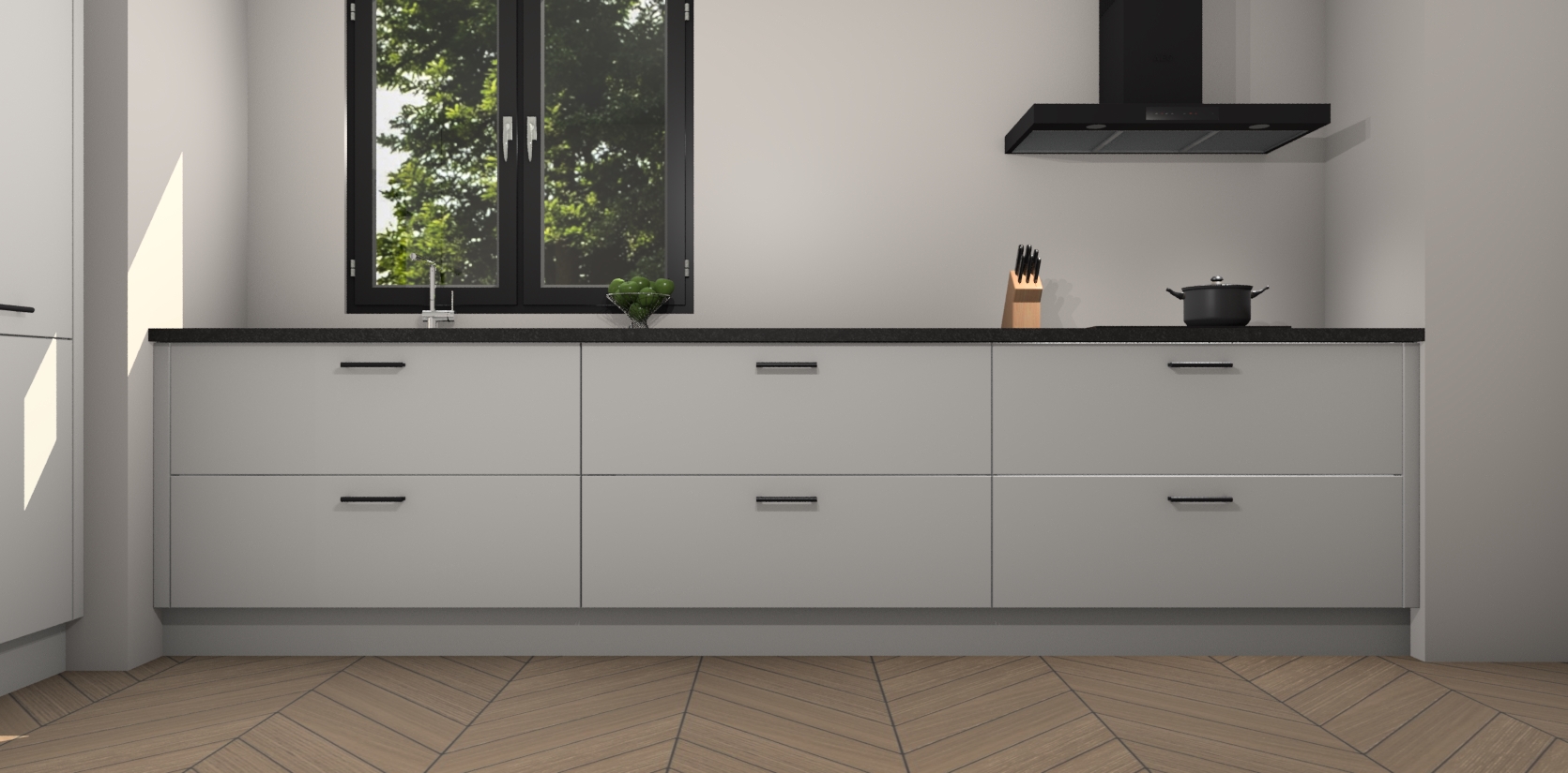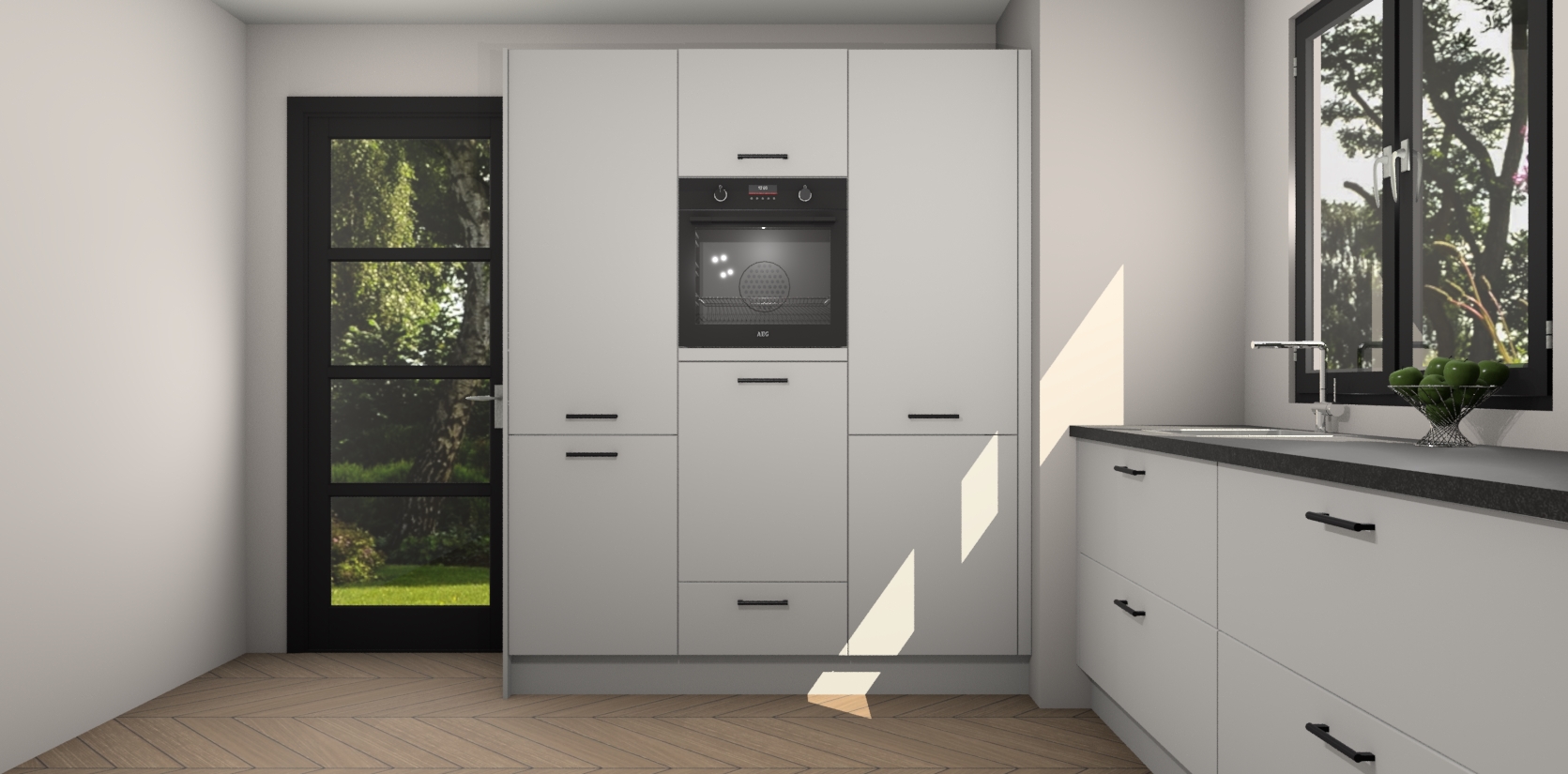 De softclose deuren openen en sluiten is ook heel eenvoudig - geniet van een moeiteloze keukenervaring, zelfs als er kinderen rondlopen. Voor extra gemak bij het plaatsen van uw bestelling bieden we ook een upgrade naar een kookplaat met geïntegreerde afzuiging.