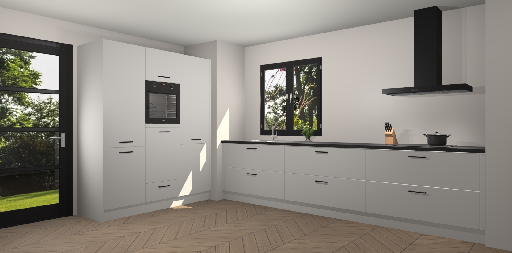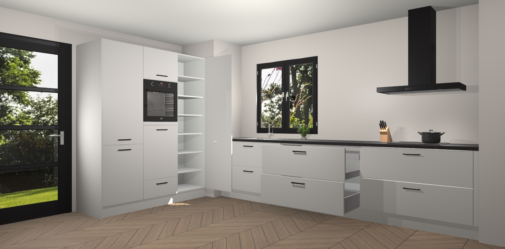 De softclose deuren openen en sluiten is ook heel eenvoudig - geniet van een moeiteloze keukenervaring, zelfs als er kinderen rondlopen. Voor extra gemak bij het plaatsen van uw bestelling bieden we ook een upgrade naar een kookplaat met geïntegreerde afzuiging.