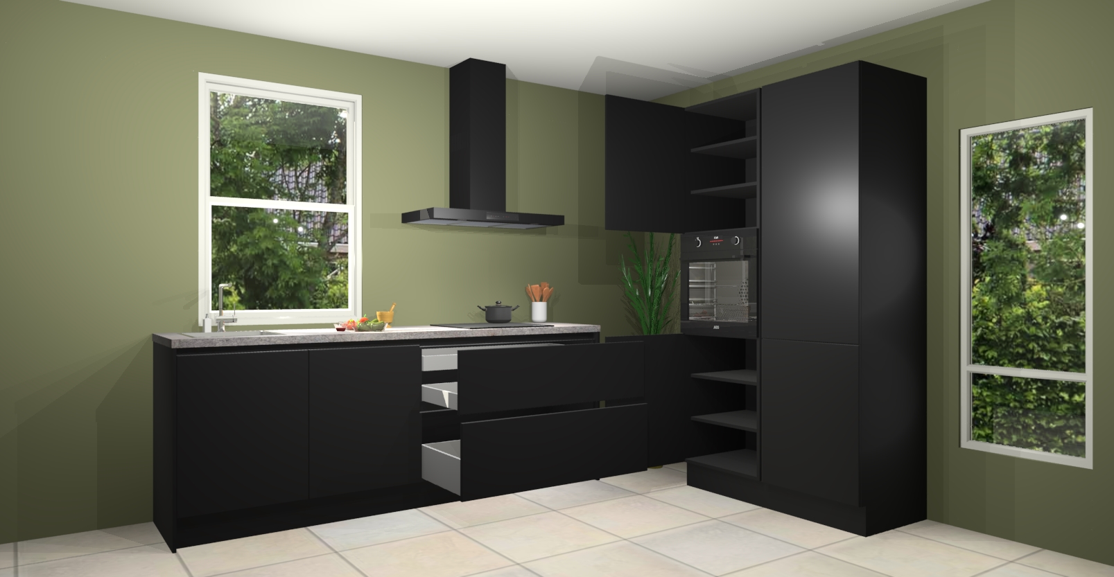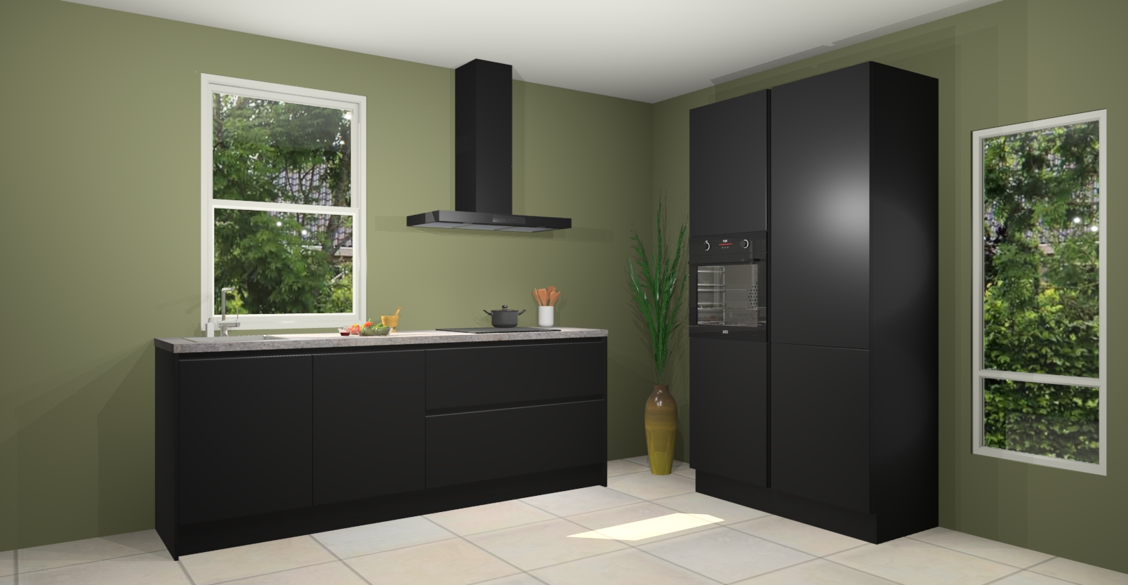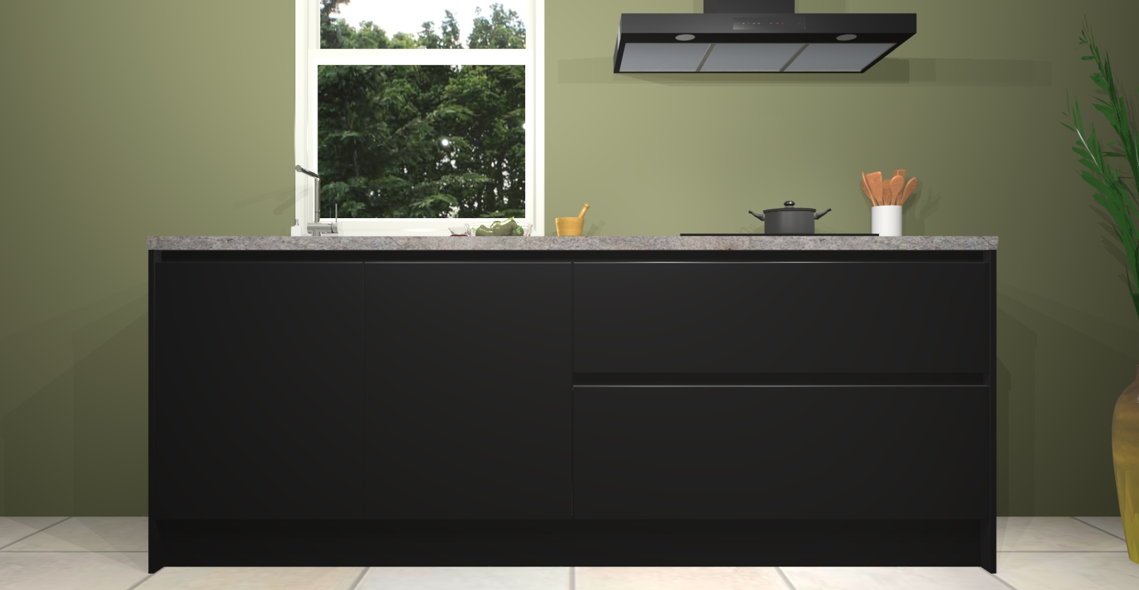 De Zwarte greeploze keuken Monaco heeft voldoende opbergruimte om uw keukenbenodigdheden georganiseerd en netjes te houden. Geniet van het gemak van de soft-close deuren, die deze stijlvolle look perfect afmaken. Maar dat is nog niet alles. Met de Zwarte greeploze keuken Monaco krijgt u maar liefst 5 ingebouwde apparaten: een oven, inductiekookplaat, afzuigkap, vaatwasser en koelkast. Deze kunnen gemakkelijk worden geüpgraded naar AEG als ze besteld zijn.