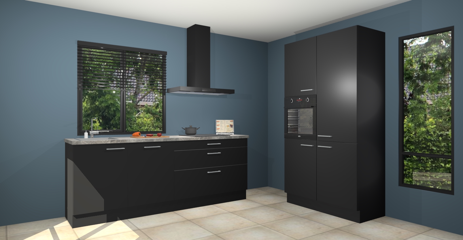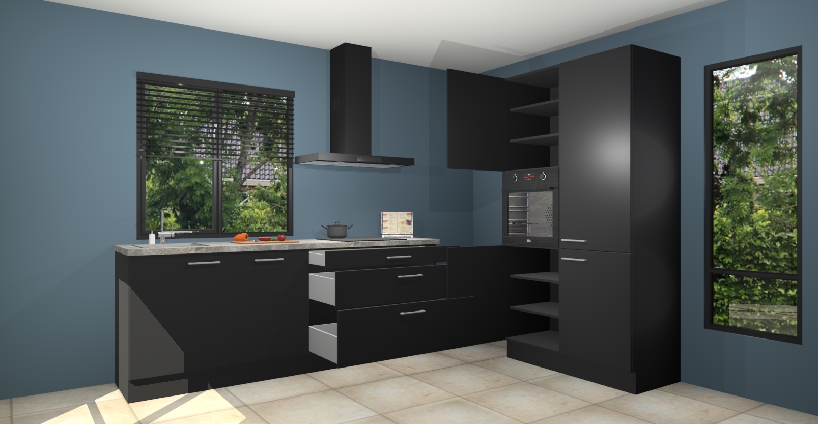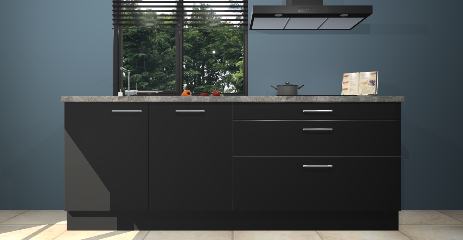 De setting is compleet gemaakt door de vijf inbouwapparaten: wanneer u gaat bestellen kunt u upgraden naar AEG-apparaten als oven, inductieplaat, afzuigkap, vaatwasser en koelkast. Kiest u voor onze Zwarte keuken Monaco, dan weet u zeker dat u te maken heeft met Duitse kwaliteit. Bovendien is er altijd sprake van een lage prijs en profiteren we aantrekkelijk leveringstermijn: die bedraagt slechts 7 weken ! Om het extra makkelijk te maken worden de keukenkasten reeds voorgemonteerd geleverd.