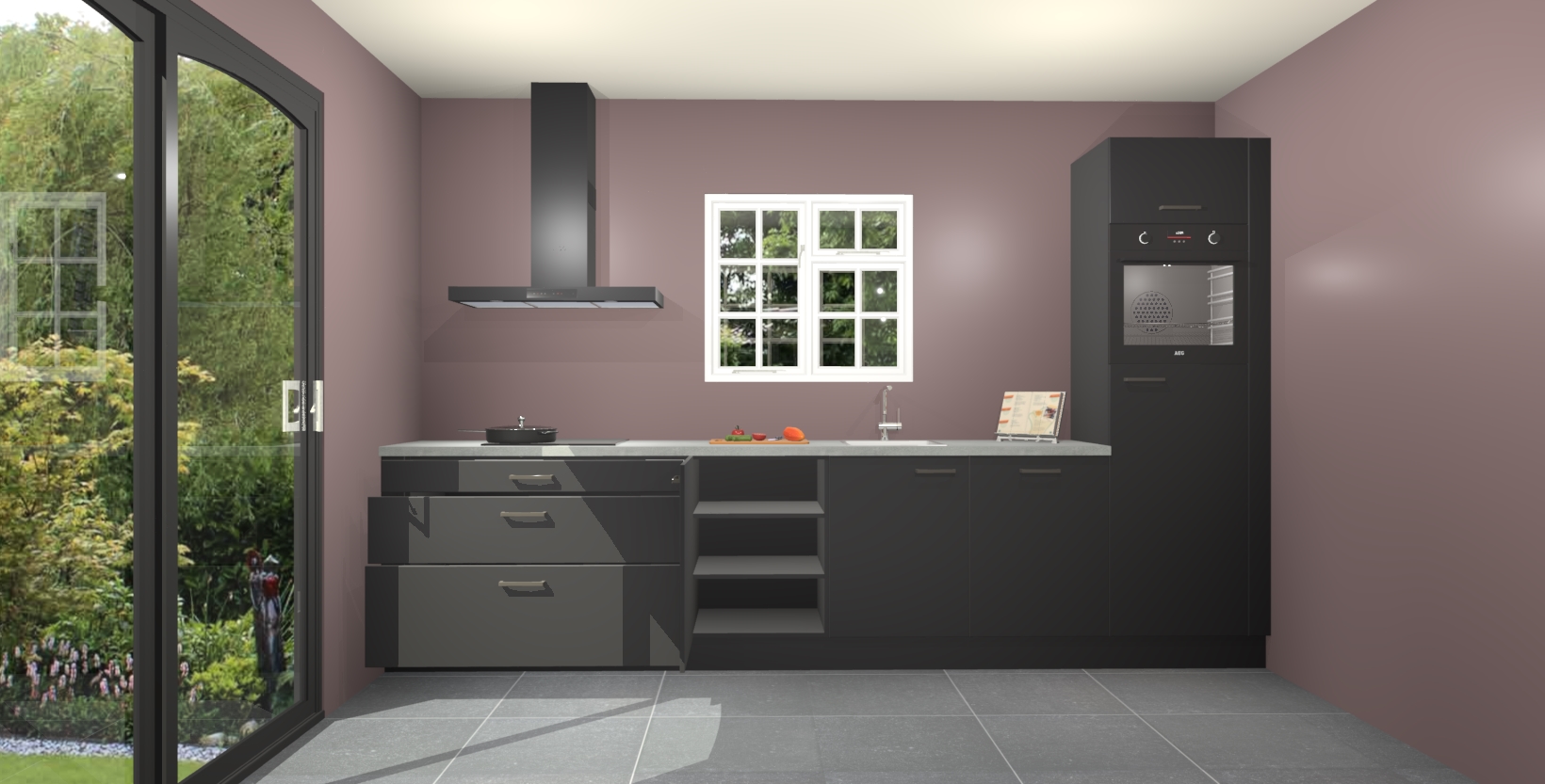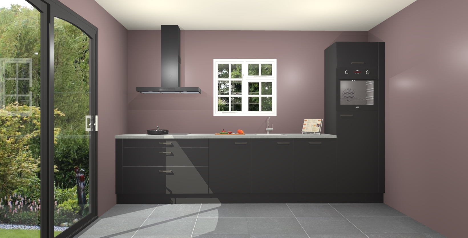 Maak kennis met de zwarte keuken Sofia: de perfecte mix van stijl en gemak. De keuken heeft vijf inbouw apparaten, plus een werkblad in houtlook dat meteen warmte en verfijning toevoegt.