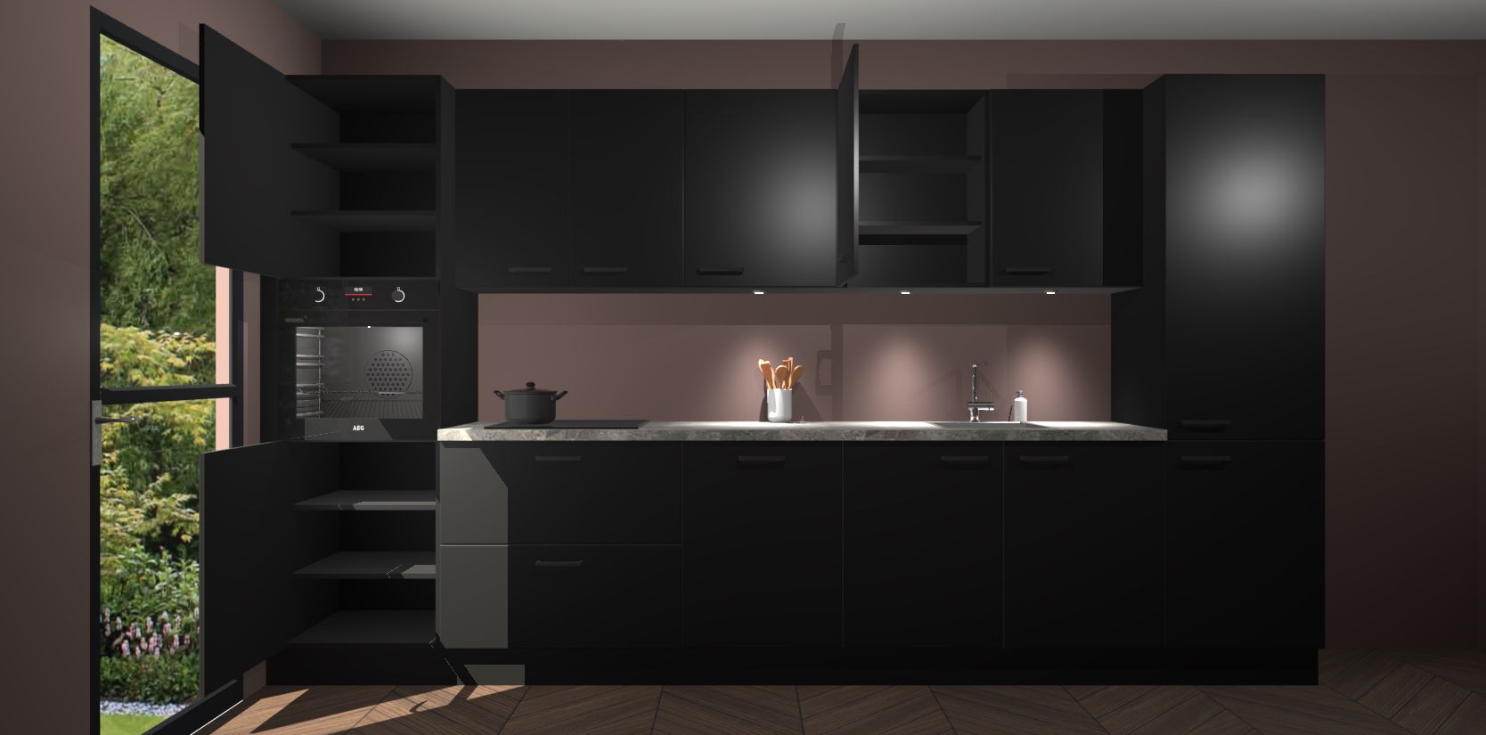 Dit is de perfecte keuken voor wie op zoek is naar een luxueuze stijl zonder zijn portemonnee te legen! Het chique ontwerp van de zwarte keuken Wels voegt dat vleugje verfijning toe aan elk huis. Het gemak van voorgemonteerde kasten bespaart u talloze uren tijd en energie, zodat u veel sneller dan verwacht kunt beginnen te genieten van uw prachtige nieuwe keuken. Bovendien bedraagt de levertijd slechts 7 weken.