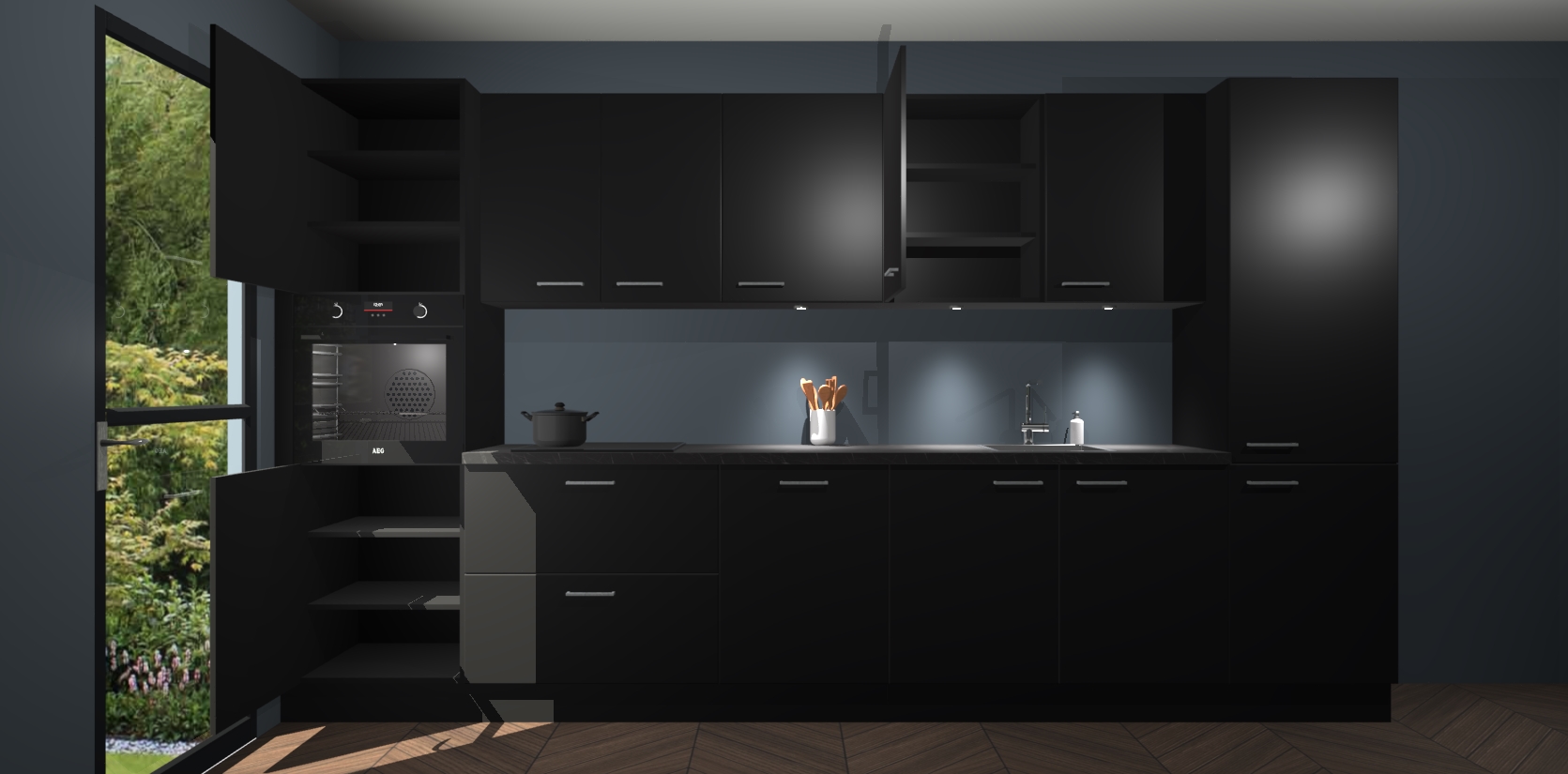 Dit is de perfecte keuken voor wie op zoek is naar een luxueuze stijl zonder zijn portemonnee te legen! Het chique ontwerp van de zwarte keuken Wels voegt dat vleugje verfijning toe aan elk huis. Het gemak van voorgemonteerde kasten bespaart u talloze uren tijd en energie, zodat u veel sneller dan verwacht kunt beginnen te genieten van uw prachtige nieuwe keuken. Bovendien bedraagt de levertijd slechts 7 weken.